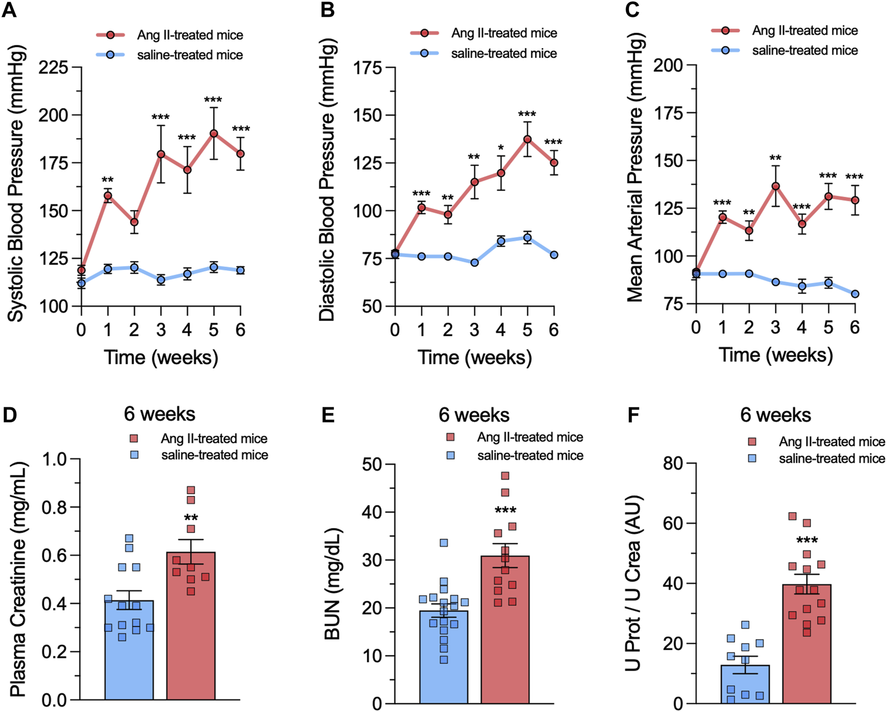 Figure 1. Ang II infusion causes hypertension and renal damage. (A–C) Averaged data of systolic blood pressure (A), diastolic blood pressure (B) and mean arterial pressure (C) over time in mice under control (saline) conditions (blue circles) or infused with Ang II (red circles) for 6 weeks. (D–F) Averaged data of plasma creatinine levels (D), blood urea nitrogen (BUN) levels (E) and the ratio of urine protein to urine creatinine (U Prot/U Crea, (F) in mice under control (saline) conditions (blue bars) or after 6 weeks of infusion with Ang II (red bars). Each bar represents the mean value ± SEM of ≥9 independent experiments. Statistical significance, *p < 0.05, **p < 0.01, ***p < 0.001; Ang II-treated mice compared to saline-treated mice (one-way ANOVA followed by Tukey’s post hoc test).