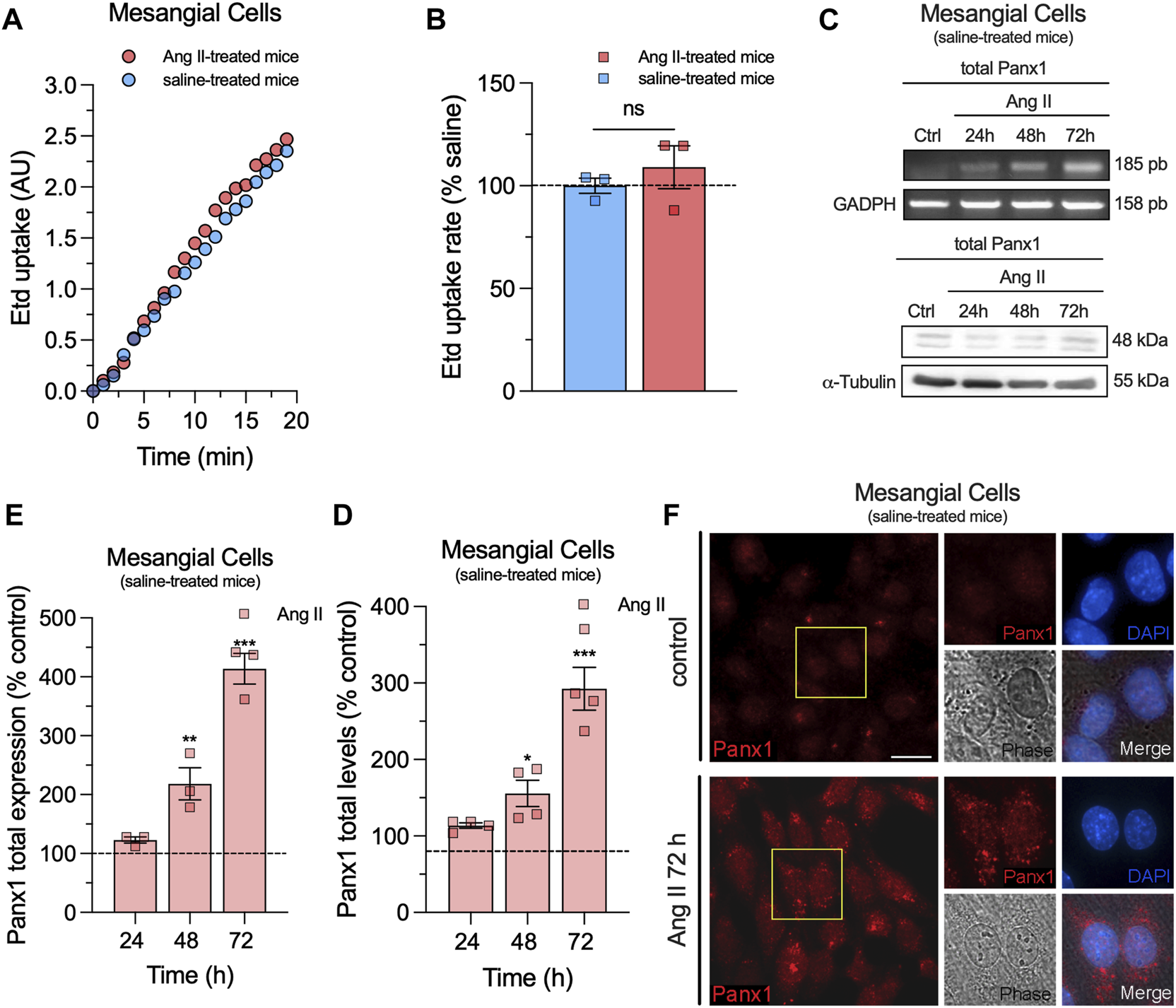 Figure 2. In vivo Ang II infusion does not impact Etd uptake, whereas Ang II in vitro enhances Panx1 expression in mesangial cells. (A) Time-lapse measurements of Etd uptake by cultured mesangial cells from saline-treated mice (blue circles) or mice infused with Ang II for 6 weeks (red circles). (B) Averaged Etd uptake rate normalized with saline condition (dashed line) by cultured mesangial cells from saline-treated mice (blue bars) or mice infused with Ang II for 6 weeks (red bars). Data were obtained from at least three independent experiments with four or more repeats each one (≥30 cells analyzed for each repeat). (C) Representative experiments of expression and protein levels of Panx1 by cultured mesangial cells from saline-treated mice under control conditions or treated with 1 μM Ang II for 24, 48 or 72 h. Levels of each analyzed band were normalized according to the levels of GADPH, and α-tubulin detected in each lane. (D, E) Quantification of expression (D) and total protein levels (E) of Panx1 normalized with the control condition (dashed line) by cultured mesangial cells from saline-treated mice stimulated with 1 μM Ang II for 24, 48 or 72 h. Each bar represents the mean value ± SEM of ≥4 independent experiments with four replicates each. Statistical significance, ***p < 0.001, **p < 0.01, *p < 0.05; Ang II vs control conditions (one-way ANOVA followed by Tukey’s post hoc test). (F) Representative immunofluorescence images depicting Panx1 (red) and DAPI (blue) staining by mesangial cells from saline-treated mice under control conditions or after treatment with 1 μM Ang II for 72 h. Calibration bar = 30 μm.