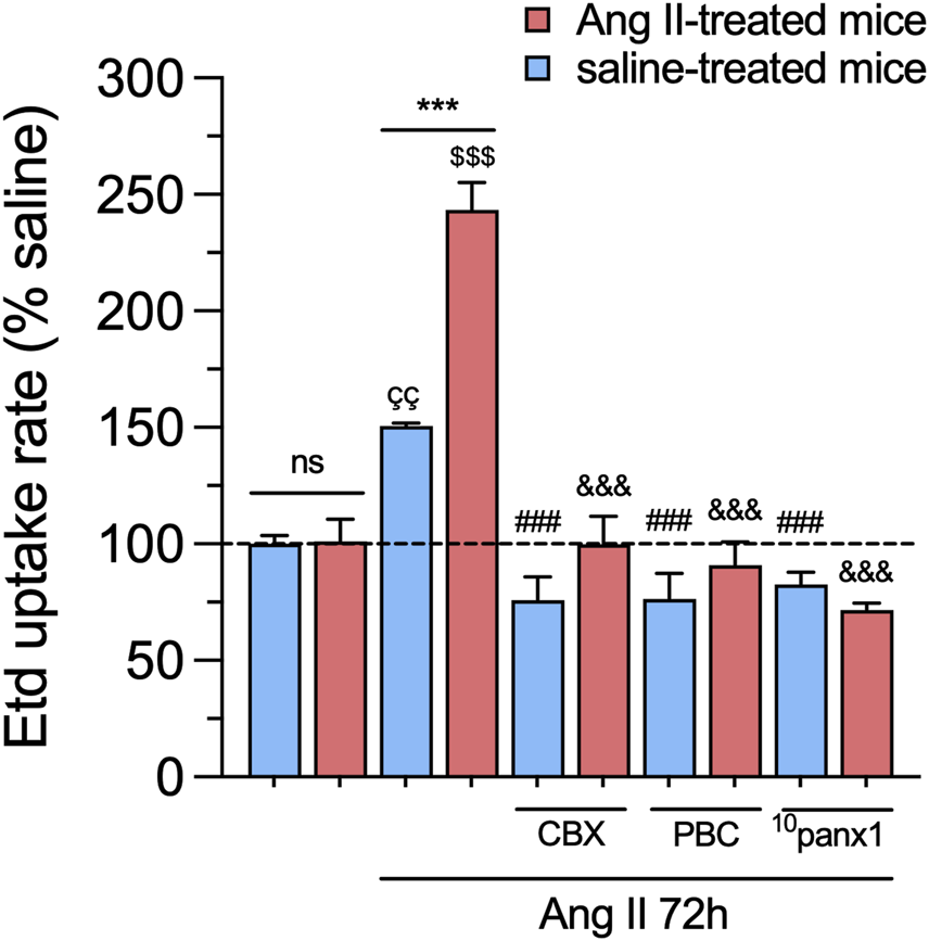 Figure 3. In vivo Ang II infusion sensitizes mesangial cells to exhibit increased Panx1 channel activity following a subsequent in vitro Ang II exposure. Averaged Etd uptake rate normalized with saline condition (dashed line) by mesangial cells from saline-treated mice (blue bars) or six-week-treated Ang II mice (red bars) under control conditions or stimulated with 1 μM of Ang II for 72 h alone or in combination with the following blockers: 10 µM carbenoxolone (CBX), 500 µM Probenecid (PBC), 50 µM 10panx1. Each bar represents the mean value ± SEM of ≥4 independent experiments with four replicates each. Statistical significance, ***p < 0.001; Ang II from Ang II-treated mice compared to Ang II from saline-treated mice; ÇÇp < 0.01; Ang II from saline-treated mice compared to saline-treated mice; $$$p < 0.001; Ang II from Ang II-treated mice compared to Ang II-treated mice; ###p < 0.001; effect of pharmacological agents compared to Ang II treatment from saline-treated mice; &&&p < 0.001; effect of pharmacological agents compared to Ang II treatment from Ang II-treated mice (one-way ANOVA followed by Tukey’s post hoc test).