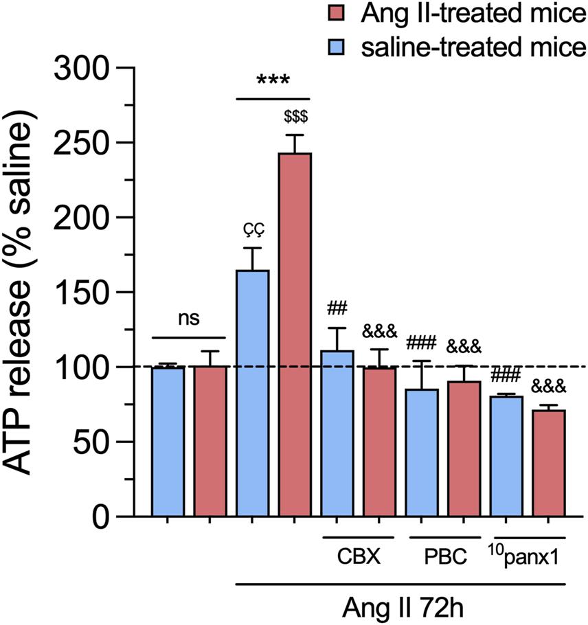 Figure 4. In vivo Ang II infusion sensitizes mesangial cells to exhibit increased Panx1 channel-dependent release of ATP following a subsequent in vitro Ang II exposure. Averaged data of ATP release normalized with saline condition (dashed line) by mesangial cells from saline-treated mice (blue bars) or six-week-treated Ang II mice (red bars) under control conditions or stimulated with 1 μM Ang II for 72 h alone or in combination with the following blockers: 10 µM carbenoxolone (CBX), 500 µM Probenecid (PBC) or 50 µM 10panx1. Each bar represents the mean value ± SEM of ≥4 independent experiments with four replicates each. Statistical significance, ***p < 0.001; Ang II from Ang II-treated mice compared to Ang II from saline-treated mice; ÇÇp < 0.01; Ang II from saline-treated mice compared to saline-treated mice; $$$p < 0.001; Ang II from Ang II-treated mice compared to Ang II-treated mice; ##p < 0.01, ###p < 0.001; effect of pharmacological agents compared to Ang II treatment from saline-treated mice; &&&p < 0.001; effect of pharmacological agents compared to Ang II treatment from Ang II-treated mice (one-way ANOVA followed by Tukey’s post hoc test).