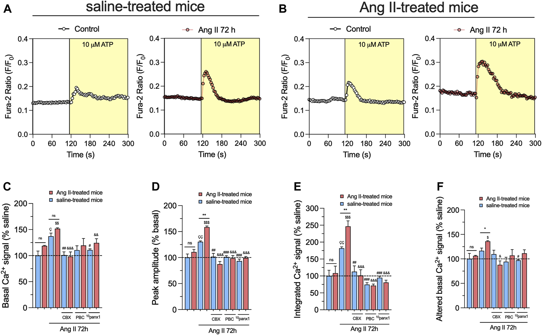 Figure 5. Panx1 channels contribute to the in vivo Ang II-induced sensitization of mesangial cells to exhibit increased basal and ATP-mediated [Ca2+]i dynamics following a subsequent in vitro Ang II exposure. (A, B) Representative plots of relative changes in Ca2+ signals over time induced by 10 µM ATP (light yellow background) by mesangial cells from saline-treated mice (A) or six-week-treated Ang II mice (B) under control conditions (white circles) or stimulated with 1 μM Ang II for 72 h (orange circles). (C–F) Averaged data normalized with saline condition (dashed line) of basal Ca2+ signal (C), ATP-induced peak amplitude normalized to basal FURA-2 ratio (D), integrated ATP-induced FURA-2 ratio response (E) and altered basal FURA-2 ratio (F) by mesangial cells from saline-treated mice (blue bars) or six-week-treated Ang II mice (red bars) under control conditions or stimulated with 1 μM Ang II for 72 h alone or in combination with the following blockers: 10 µM carbenoxolone (CBX), 500 µM Probenecid (PBC) or 50 µM 10panx1. Each bar represents the mean value ± SEM of ≥4 independent experiments with four replicates each. Statistical significance, *p < 0.05, **p < 0.01; Ang II from Ang II-treated mice compared to Ang II from saline-treated mice; Çp < 0.05, ÇÇp < 0.01; Ang II from saline-treated mice compared to saline-treated mice; $p < 0.05, $$p < 0.01, $$$p < 0.001; Ang II from Ang II-treated mice compared to Ang II-treated mice; #p < 0.05, ##p < 0.01, ###p < 0.001; effect of pharmacological agents compared to Ang II treatment from saline-treated mice; &p < 0.05, &&p < 0.01, &&&p < 0.001; effect of pharmacological agents compared to Ang II treatment from Ang II-treated mice (one-way ANOVA followed by Tukey’s post hoc test).
