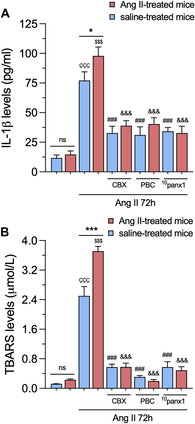 Figure 6. Panx1 channels contribute to the in vivo Ang II-induced sensitization of mesangial cells to exhibit increased IL-1β release and lipid peroxidation following a subsequent in vitro Ang II exposure. (A, B) Averaged data of IL-1β (A) or TBARS (B) levels by mesangial cells from saline-treated mice (blue bars) or six-week-treated Ang II mice (red bars) under control conditions or stimulated with 1 μM Ang II for 72 h alone or in combination with the following blockers: 10 µM carbenoxolone (CBX), 500 µM Probenecid (PBC) or 50 µM 10panx1. Each bar represents the mean value ± SEM of ≥4 independent experiments with four replicates each. Statistical significance, ***p < 0.001; Ang II from Ang II-treated mice compared to Ang II from saline-treated mice; ÇÇÇp < 0.001; Ang II from saline-treated mice compared to saline-treated mice; $$$p < 0.001; Ang II from Ang II-treated mice compared to Ang II-treated mice; ###p < 0.001; effect of pharmacological agents compared to Ang II treatment from saline-treated mice; &&&p < 0.001; effect of pharmacological agents compared to Ang II treatment from Ang II-treated mice (one-way ANOVA followed by Tukey’s post hoc test).