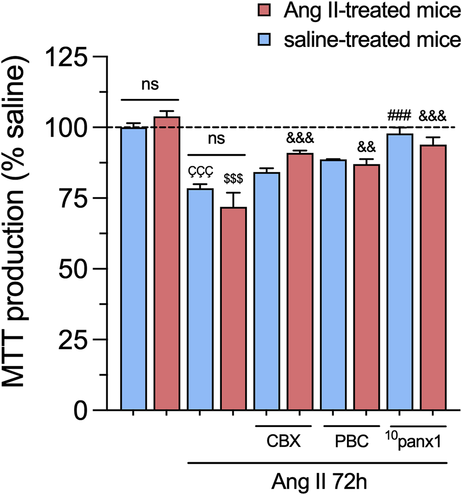 Figure 7. Panx1 channels contribute to the in vitro Ang II-induced decrease in cell viability in mesangial cells. Graphs showing the measurement of cell viability (MTT production) normalized with saline condition (dashed line) by mesangial cells from saline-treated mice (blue bars) or six-week-treated Ang II mice (red bars) under control conditions or stimulated with 1 μM Ang II for 72 h alone or in combination with the following blockers: 10 µM carbenoxolone (CBX), 500 µM Probenecid (PBC) or 50 µM 10panx1. Each bar represents the mean value ± SEM of ≥4 independent experiments with four replicates each. Statistical significance, ÇÇÇp < 0.001; Ang II from saline-treated mice compared to saline-treated mice; $$$p < 0.001; Ang II from Ang II-treated mice compared to Ang II-treated mice; ###p < 0.001; effect of pharmacological agents compared to Ang II treatment from saline-treated mice; &&p < 0.01, &&&p < 0.001; effect of pharmacological agents compared to Ang II treatment from Ang II-treated mice (one-way ANOVA followed by Tukey’s post hoc test).