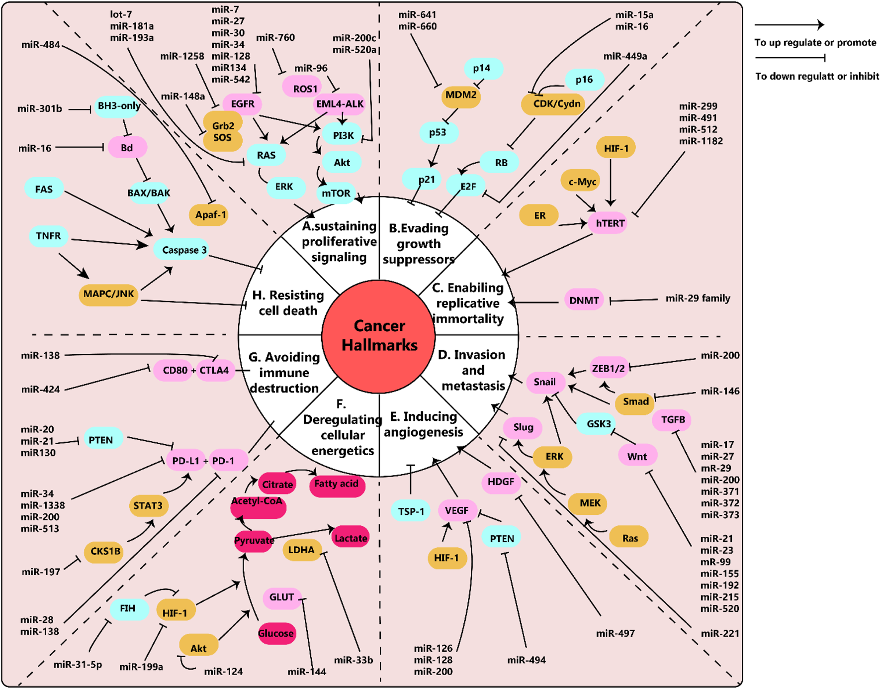 Figure 1. (A) schema of microRNAs and their pathways network in cancer. Epidermal growth factor (EGF) and its receptors, EGFR, work together to stimulate cell growth in lung cancer through the downstream RAS/ERK and PI3K/Akt/mTOR pathways. Similarly, EML4-ALK and ROS1 also trigger cancer cell growth through these pathways. Relevant miRNAs are depicted in the diagram. (B) Disruptions in tumor suppressors, RB and p53, enable cancer cells to avoid inhibition of growth. (C) The human telomerase reverse transcriptase (hTERT) is linked to the immortality of cancer cells. MiR-299, miR-491, miR-512, and miR-1182 have been found to target hTERT, but these findings have been studied in various cancer cells other than lung cancer. Additionally, the miR-29 family can control telomere length by targeting DNA methyltransferases (DNMT). (D) Snail, Slug, and Wnt are key factors in epithelial to mesenchymal transition (EMT), which is associated with cancer metastasis and invasion. The diagram shows the related miRNAs. (E) Vascular endothelial growth factors (VEGF) play a crucial role in promoting tumor angiogenesis. MiR-126, miR-128, and miR0-200 have been shown to target VEGF. (F) Cancer cells use aerobic glycolysis as their main metabolic pathway. For example, lung cancer cells with decreased levels of miR-144 exhibit increased expression of glucose transporter (GLUT1) and higher glucose uptake. (G) The interaction between programmed death-ligand 1 (PD-L1) and its receptor (PD-1) allows cancer cells to evade immune destruction. MiR-34, miR-138, miR-200, and miR-513 have been found to target PD-L1 and inhibit its expression. (H) Fas receptors (intrinsic pathway) and BH3-only proteins (extrinsic pathway) play important roles in preventing cell apoptosis. MiR-301b targets BH3-only proteins and miR-16 targets Bcl, both of which are involved in regulating cell apoptosis. Note: This diagram simplifies the major pathways involved in cancer, but there may also be cross-talk and interactions between different pathways that are not shown. For example, the EGFR pathway can not only promote cell proliferation but also enhance invasion, metastasis, angiogenesis, and resistance to apoptosis. This figure adapted from (Wu et al., 2019).
