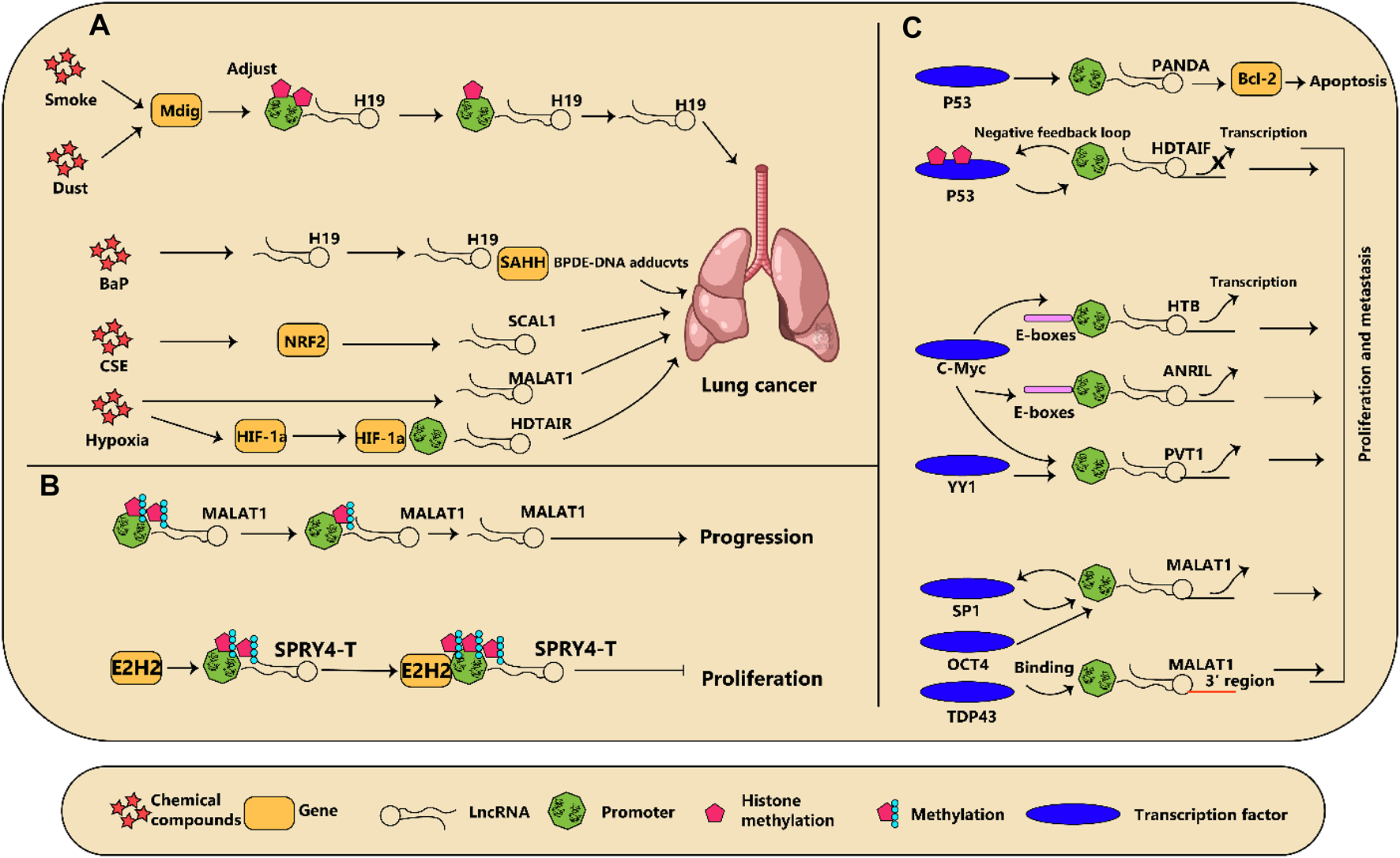 Figure 2. (A) diagram illustrating how regulation of dysregulated long non-coding RNAs (lncRNA) in lung cancer is influenced by various factors is shown. (A) Chemical compounds and reduction in oxygen levels regulate lncRNA expression which subsequently results in the advancement of cancer. (B) Modifications to the epigenetic makeup of lncRNAs can impact the growth of lung tumors. (C) Several transcription factors connect to lncRNAs and either incite or discourage their transcription, leading to changes in cancer development.