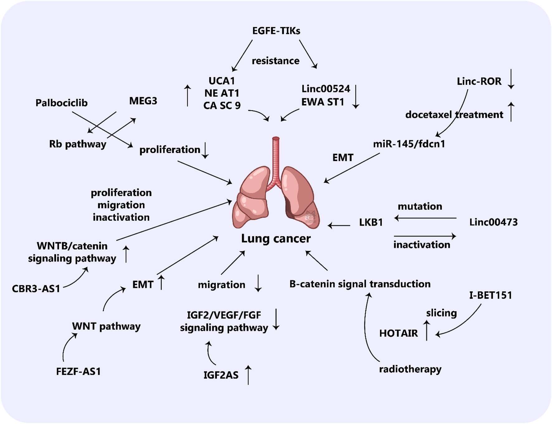 To sum up, it has been revealed that lung cancer is an intricate disorder with many unknown regulators. ncRNAs can influence gene expression which in turn can increase or decrease the risk of lung cancer. Examples of ncRNAs that affect these pathways are microRNAs (miRNAs), circRNAs, piRNAs, and lncRNAs. In certain instances, these molecules, such as lnc-JPX, can exercise their influence on multiple pathways. ncRNAs can either be induced or inhibited, which can be utilized to diagnose the early onset of lung cancer, establish the occurrence of metastasis, or foresee recurrent cancer after surgery. Furthermore, certain ncRNAs can either resist or restore sensitivity to medication. For example, miR-21 is known to promote the formation of tumors and occurs in many targets. Nevertheless, the exact mechanisms of action for many of the molecules remain unclear. Some potential future directions for research on ncRNAs in cancer include: 1) Identification and validation of ncRNA biomarkers: Researchers are actively searching for specific ncRNA biomarkers that could help with early detection, diagnosis, and prognostication of cancer. For example, miRNAs have shown promise as potential biomarkers for breast, colorectal, and lung cancer, and other ncRNAs like lncRNAs and circRNAs are also being studied as potential biomarkers. Scientists are currently working on large-scale studies to validate these biomarkers and determine their clinical usefulness. 2) Understanding the role of ncRNAs in cancer progression: Many ncRNAs have been found to play critical roles in cancer progression by promoting tumor growth, invasion, and metastasis. Therefore, further research is needed to fully understand the mechanisms of how these ncRNAs contribute to cancer development and progression, which could lead to the identification of new therapeutic targets. 3) Development of therapeutic strategies targeting ncRNAs: ncRNAs are potential targets for cancer therapy, and there are various methods being explored. One such approach involves using antisense oligonucleotides (ASOs) or small interfering RNAs (siRNAs) to target and degrade specific ncRNAs. Other methods include using small molecules or natural compounds to inhibit the function of specific ncRNAs. Additionally, researchers are exploring the use of CRISPR-Cas9 gene editing to modify ncRNA expression in cancer cells. 4) Combination therapy with ncRNA-targeting agents: Some researchers are investigating the potential of combining ncRNA-targeting agents with other cancer treatments, such as chemotherapy, radiation therapy, or immunotherapy. This combination therapy could potentially overcome resistance to existing cancer treatments and improve patient outcomes.