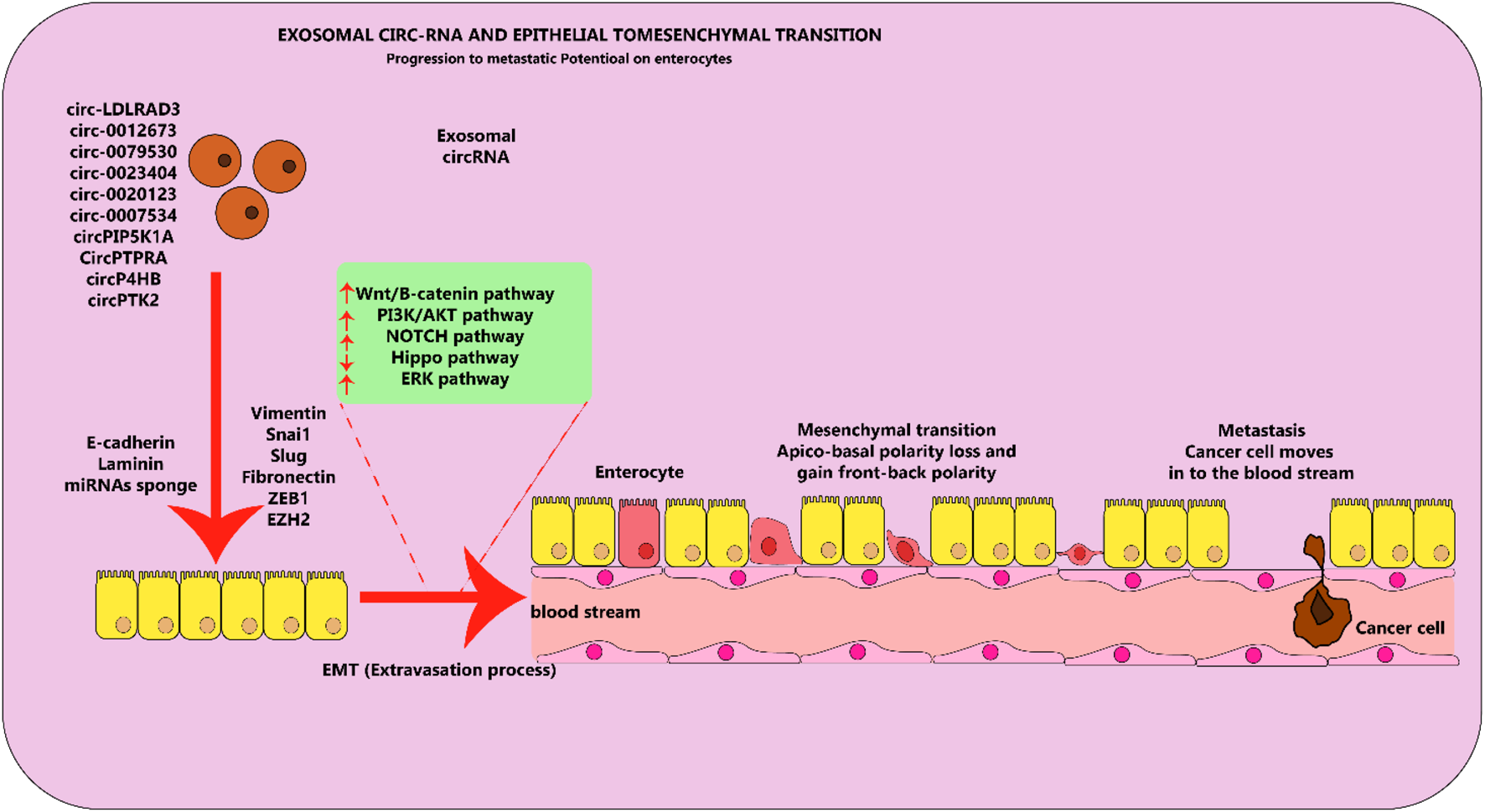 Figure 5. Exosomal circRNA molecules play an important role in the EMT process in lung cancer cells. Circular RNA molecules found in exosomes, which are elevated in levels and contribute to cancer-causing actions, facilitate the process of EMT by stimulating or hindering various pathways in lung cancer. This figure adapted from (Hussen et al., 2022).