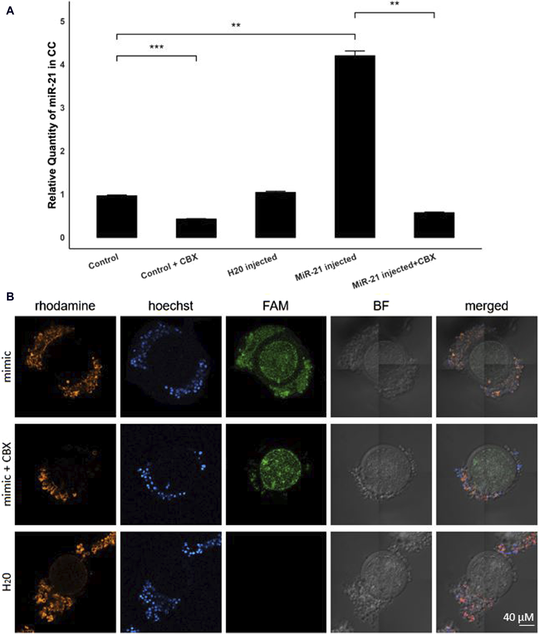 Figure 3. Bta-miR-21-5p expression after micro-injection with bta-mir-21-5p mimics. (A) The relative expression levels of bta-miR-21-5p between the cumulus cells from the control group and the cumulus cells from the bta-mir-21-5p injected group, both with or without CBX in the maturation medium and the H20 injected group. Data are represented as mean ± SEM of triplicates from three experiments. (B) Bright-field and fluorescence images show the FAM fluorescence from the mimic present in the injected oocytes. The cumulus cells from COCs matured in the presence with CBX have less FAM fluorescence. Hoechst and rhodamine staining visualized the nucleus and GJ network, respectively. All pictures are shown at the same magnification, indicated in the bottom right corner. (CC, cumulus cells; CBX, carbenoxolone; mimic, FAM labeled miR-21 mimic; FAM, carboxyfluorescein; BF, bright field).
