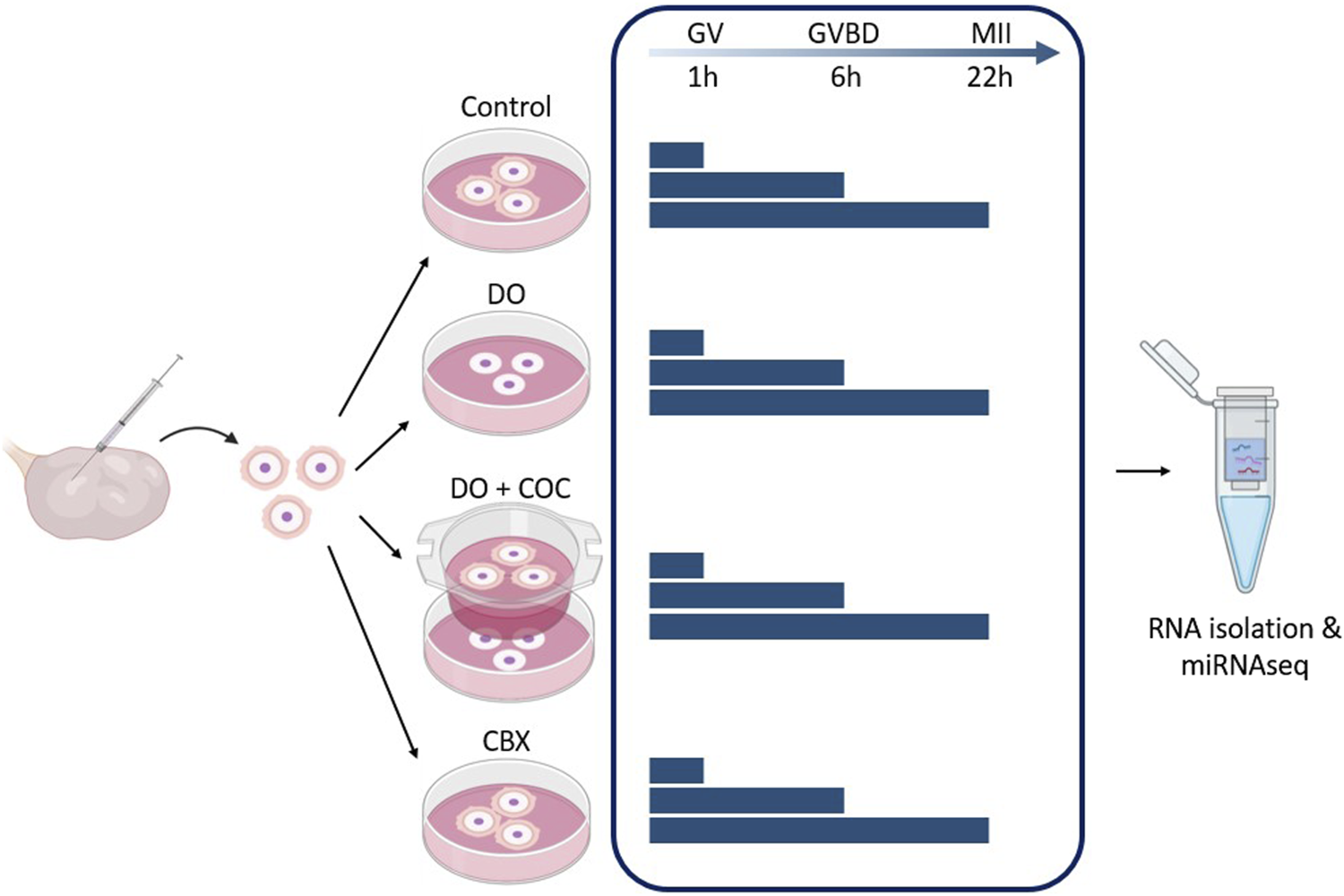 Figure 4. Experimental design 1: influence of gap junctions (GJ) on miRNA profile of oocytes and cumulus cells. Carbenoxolone (CBX), a GJ blocker, was added to the maturation medium of one group. As controls, there was a normal condition group (Control), a group with denuded oocytes (DO) and a group of denuded oocytes with COCs in co-culture (DO + COC). Three replicates from each group were matured for 1, 6, and 22 h before total RNA isolation and miRNA sequencing. (GV, germinal vesicle; GVBD, germinal vesicle breakdown; MII, metaphase II stage). Created with Biorender.com.