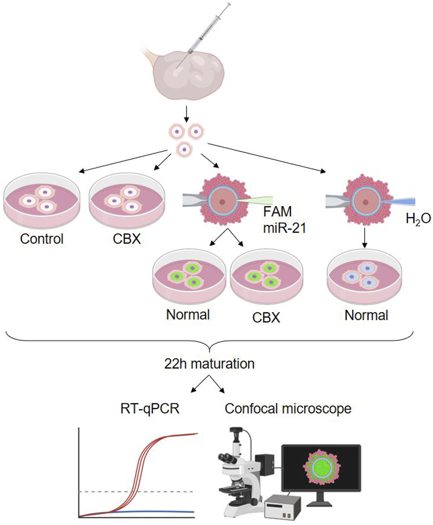 The second experimental design included five different experimental groups: two non-injected control groups, cultured with or without CBX, two FAM labeled bta-miR-21-5p mimic injected groups cultured with or without CBX, and one group injected with H20, the solvent. A schematic overview of these groups is shown in Figure 5. A single replicate consisting of 15 oocytes for each group was used for fluorescent staining, while three replicates, each consisting of 15 oocytes, were used for RT-qPCR.