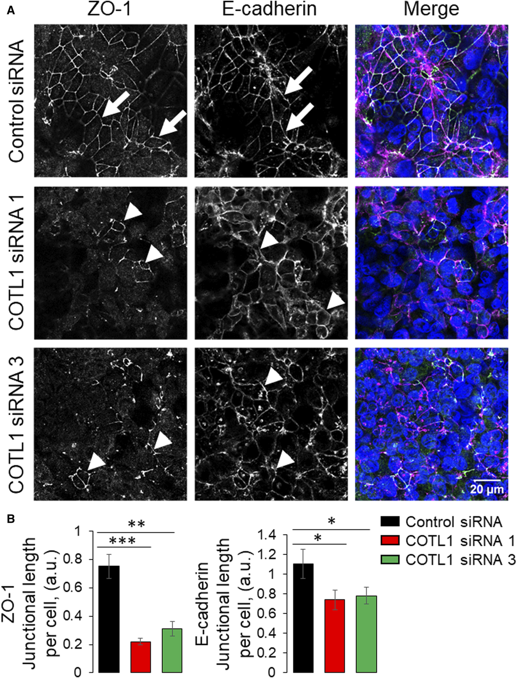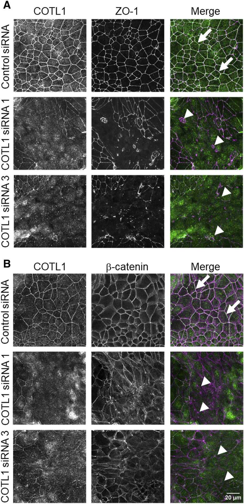 Loss of COTL1 impairs the assembly of epithelial tight and adherens junctions. Confocal microscopy images of control and COTL1-depleted DLD1 cells dual-immunolabeled for COTL1 (green) and either ZO-1 [(A), magenta], or β-catenin [(B), magenta)] on day 4 after siRNA transfection. Arrows indicate intact TJ and AJ in control cell monolayers and arrowheads point at junctional disassembly in COTL1-depleted cells. Images shown are representative of three independent experiments with multiple images taken per slide.