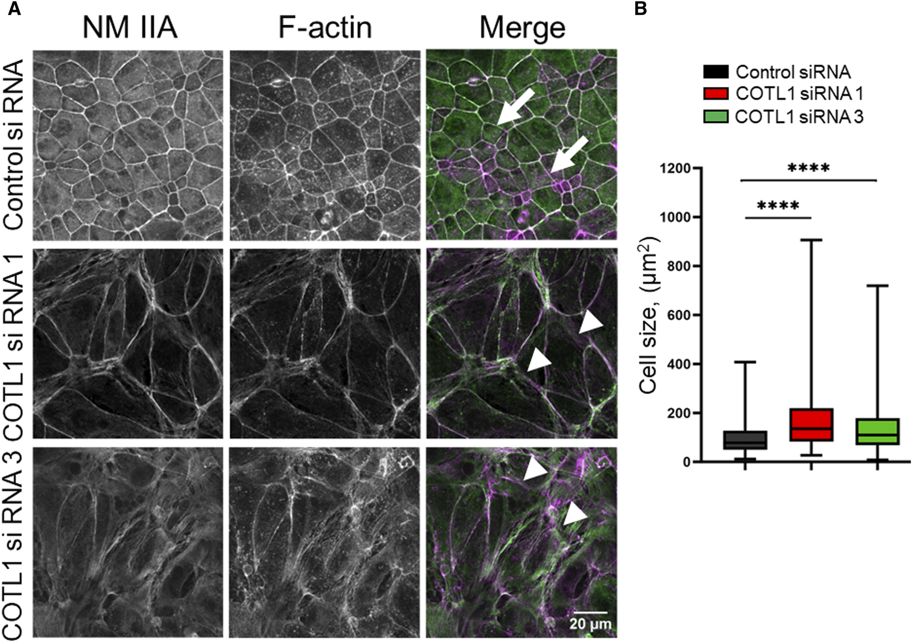 For cell size measurement, the images were prepared by making a maximum intensity projection from a small z-stack captured through the monolayer of cells. Initially the cells were detected using a deep learning-based method CellPose (v3.0.8). We used the pretrained model “cyto3” with a diameter of 100, flow threshold 0.6 and cell probability threshold of −1 for the detection of cells. The results of the initial segmentation were manually corrected for any errors, to add missing cells, and, to remove incomplete cells on the edge of the images. ROIs of the cells were imported and measured in FIJI distribution of ImageJ (v1.53t). Total cell numbers were 385, 189, and 204 for controls siRNA, COTL1 siRNA1 and COTL1 siRNA3 groups, respectively. Four different images were quantified for each experimental group.