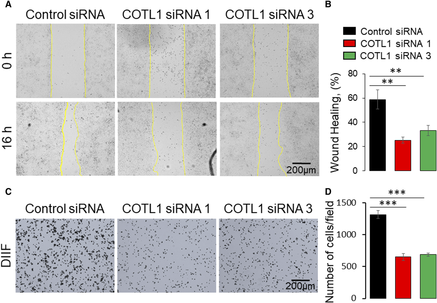 Depletion of COTL1 inhibits collective epithelial cell migration and cell-matrix attachment. (A, B) Wound healing assay in control and COTL1-depleted DLD1 cells. Representative wound images (A) and quantification of the wounded area (B) are shown. (C, D) Collagen I matrix attachment assay of control and COTL1-depleted DLD1 cells. Representative images of adhered cells (C) and quantification of cells adhered at 30 min after plating (D). Mean ± SE [(A, B): n = 4; (C, D): n = 3]; **p < 0.01; ***p < 0.0005, as compared to the control siRNA group.