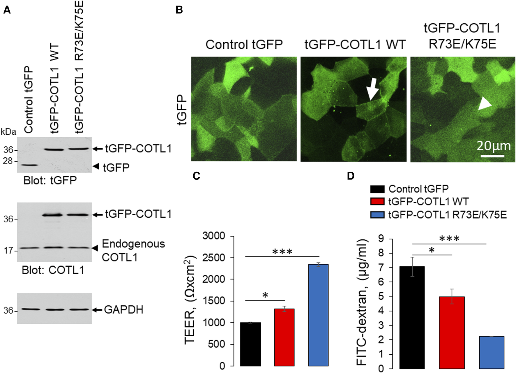 Overexpression of wild type COTL1 and its F-actin binding deficient mutant decreases IEC barrier permeability. (A) Immunoblotting analysis of DLD1 cells expressing either control tGFP, tGFP-tagged full-length COTL1 (tGFP-COTL1 WT) or the COTL1 mutant unable to bind F-actin (tGFP-COTL1 R73E/K75E). (B) Imaging of tGFP fluorescence in DLD1 cells overexpressing either control tGFP, tGFP-COTL1 WT, or tGFP-COTL1 R73E/K75E. Arrow indicates localization of wild-type tGFP-COTL1 at epithelial junctions. Arrowhead points at non-junctional localization of the COTL1 actin-uncouple mutant. (C) Transepithelial electrical resistance and (D) transmonolayer FITC-dextran flux in DLD1 cells expressing control tGFP, tGFP-COTL1 WT or tGFP-COTL1 R73E/K75E mutant. Means ± SE (n = 3); *p < 0.05, ***p < 0.0005 as compared to control tGFP expressing cells.