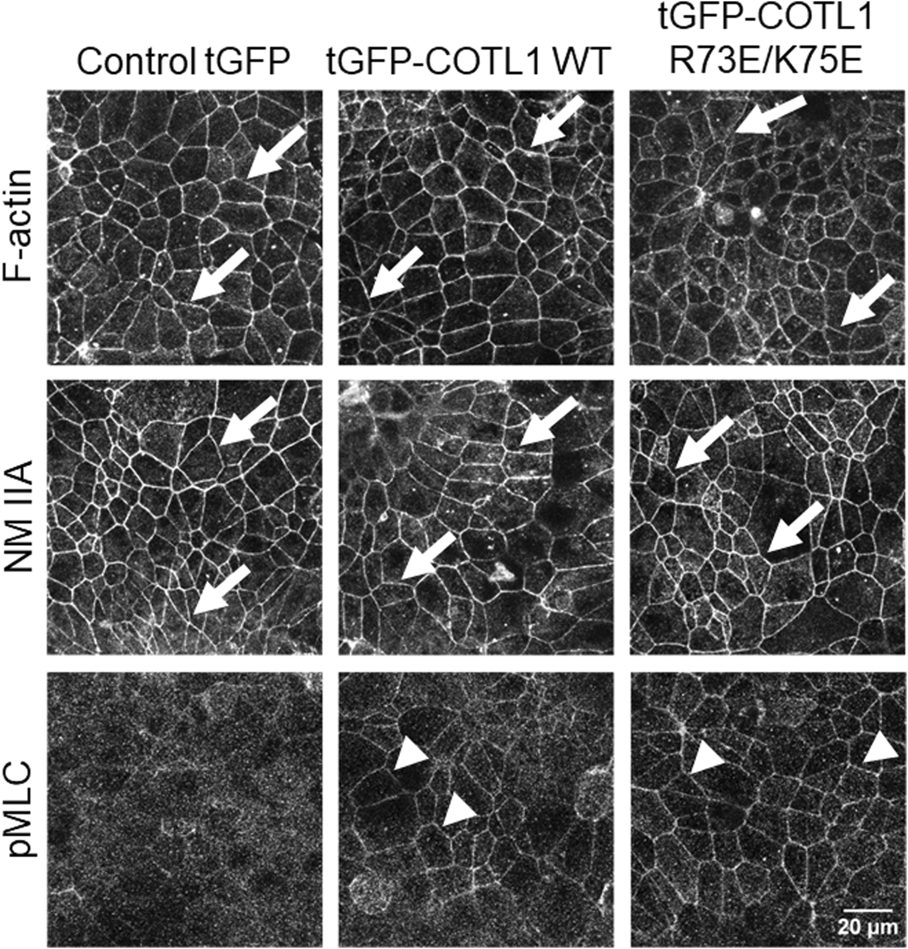 Given the known interactions of COTL1 with actin filaments (de Hostos et al., 1993; Provost et al., 2001a; Dai et al., 2006) and the observed abnormal assembly of the perijunctional F-actin belt in COTL1 depleted IEC (Figure 5; Supplementary Figure S8), we rationalized that the regulatory effects of COTL1 on the IEC barrier integrity and repair could depend on its direct interactions with actin filaments. To test this hypothesis, we generated DLD1 cell lines stably expressing tGFP-labeled wild-type COTL1, a COTL1 R73E/K75E mutant that does not bind actin (Kim et al., 2014; Liu et al., 2018), or control tGFP. The exogenous wild type and mutant COTL1 were expressed at similar levels, about 2-fold and 1.7-fold higher than the endogenous COTL1 expression (Figure 8A). Interestingly, while wild-type tGFP-COTL1 significantly accumulated at apical junctions (Figure 8B, arrow), no junctional enrichment was characteristic for the actin-uncoupled COTL1 mutant (Figure 8B, arrowhead). Overexpression of WT COTL1 resulted in tightening of the paracellular barrier according to the increased TEER (Figure 8C) and decreased transepithelial FITC-dextran flux (Figure 8D). Surprisingly, such barrier-enhancing effects were even more pronounced in the cells overexpressing the actin uncoupled COTL1 mutant (Figures 8C, D). We further examined the effects of COTL1 overexpression on the IEC barrier by visualizing apical junctions. While no marked alterations in the TJ and AJ assembly were detected (Supplementary Figure S11A), immunofluorescence labeling and confocal microscopy revealed ZO-1 accumulation at the multicellular and tricellular vertices in COTL1 mutant overexpressing DLD1 cells (Supplementary Figure S11A, B arrows). Furthermore, overexpression of either wild type or the actin filament uncoupled COTL1 mutant did not markedly affect the integrity of the perijunctional actomyosin belt (Figure 9, arrows). Overexpression of both WT and mutant COTL1, however, increased MLC phosphorylation at the perijunctional F-actin belt (Figure 9, arrowheads), which is indicative of increased activity of junction-associated NM II. Thus, the relative signal intensity of perijunctional pMLC was 2.26 ± 0.19 and 2.23 ± 0.28 fold higher in DLD1 cells expressing the wild type and mutant COTL1, respectively, comparing to control tGFP-expressing cells. Immunoblotting analysis revealed no effects of COTL1 overexpression on total pMLC level and no changes in other cytoskeleton-related signaling, such as phosphorylation of cofilin and ezrin-moesin-radixin (ERM) proteins (Supplementary Figure S12). Together, the described data suggest that while COTL1 enhances the IEC barrier its barrier-enhancing activity is uncoupled from the actin filament binding.