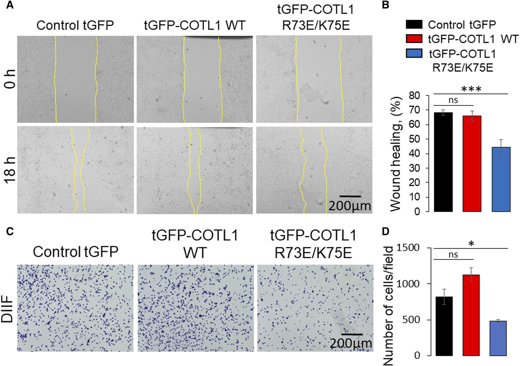 For live cell imaging, tGFP-COTL1 WT and tGFP-COTL1 R73E/K75E cells were grown in a coverslip bottom dish with 4 compartments, µ-Dish 35 mm Quad (Ibidi GmbH, Gräfelfing, Germany, Cat# 80416). Once the monolayer was achieved a scratch was made using a pipette tip in each of the quadrants. Multiple locations were identified along the edge to locate the cells with characteristics of migration. A Leica 63x CS2 (1.4NA) OIL immersion objective and Leica TCS SP8 AOBS confocal laser scanning system attached to a Leica DMi8 inverted epifluorescence microscope and equipped with a stage top incubator (OKOLAB United States Inc. Sewickley, United States) were used for live cell imaging. Argon laser was set to 30% power during the startup and the final laser power for the 488 nm laser line was kept low using AOBS (1.5%) during scanning. A scanning speed of 600 Hz allowed us to achieve a low pixel dwell time of 0.4 µs We did not directly measure the effect of phototoxicity on cells; however, a DIC scan along with the fluorescence was also captured allowing us to see overall cell morphology. The combination of low laser power, low pixel dwell time, and 1-minute intervals allowed us to keep the effect of phototoxicity to a minimum while permitting the capture of very dynamic movements of COTL1. The FIJI distribution of ImageJ (v 1.53t) was used to apply the median filter to timelapse images and for making the final movies. Time-lapse images for multiple positions across the edge of the scratch were captured at 1-minute intervals for 6 h. This experiment was repeated 3 times, and the representative field of views was selected for generating the movie. A median filter was applied to the time-lapse images to reduce the noise before exporting them as AVI.