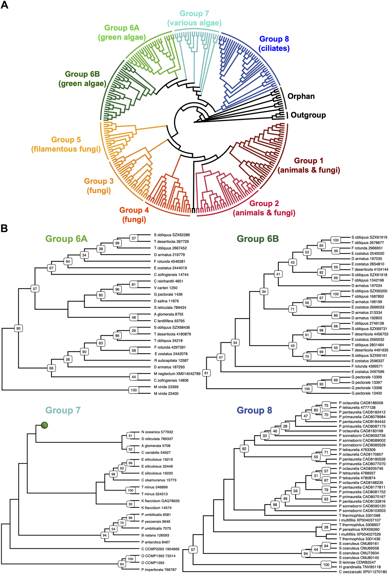 Septins in Archaeplastida and Chromista form new phylogenetic clades outside of the previously defined Groups 1–5, herein named Groups 6A, 6B, 7, and 8. Group 6A and 6B are composed exclusively of septins from various green algae, while septins in Groups 7 and 8 belong to other various algae (some other green algae, red algae, heterokonts, haptophytes, cryptophytes, chlorarachniophytes) and ciliates, respectively. It is peculiar that these septins in algae from diverse groups formed a single clade separate from the ciliate septins, which is inconsistent with the general taxonomical classification of these species (compare Fig. 1 and Fig. 2A). It is tempting to speculate that these algal septins may have spread through horizontal transfer of nuclear genes, when ancestral red and green algae were taken up by other eukaryotes to form secondary and tertiary endosymbiosis (Keeling and Palmer, 2008; Archibald, 2012).
