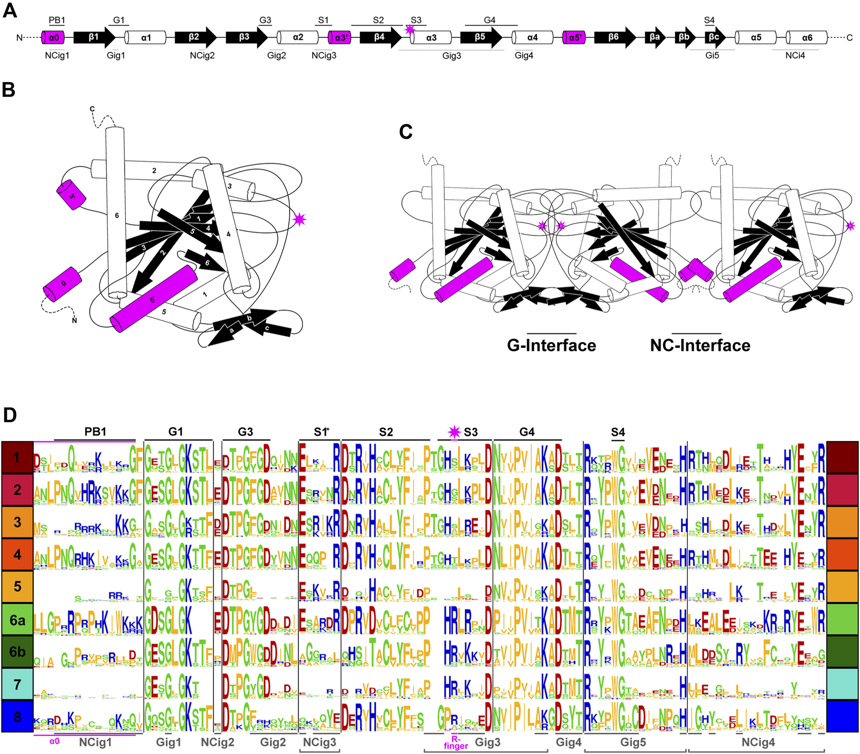 Patterns of conservation and diversity of interface motifs across septin Groups. (A) Topology diagram of the GTPase domain secondary structures from N to C-terminus. Conserved GTPase motifs and septin motifs are noted above by black lines (based on Grupp and Gronemeyer, 2023) and the NC and G-interacting group regions are noted below by dashed lines (based on Auxier et al., 2019). The typical position of the R-finger (when present) is indicated by the pink star. (B) A folded septin monomer. This aggregate depiction includes all predicted domains across eukaryote septins. Relative positions of secondary structures are based on PDB structures 7M6J and 8FWP (Mendonça et al., 2021; Grupp and Gronemeyer, 2023; Marques da Silva et al., 2023). (C) A septin trimer approximating interactions through their G- and NC-interfaces, based on PDB structure 7M6J. Grey stars with pink outline indicate the predicted positions of R-fingers if they are present in the subunits forming an interface. (D) Weblogo representation of select septin motifs, interacting groups, and structural elements across the eukaryotic septin groups. GTPase motifs and septin motifs are depicted above in black, and NC and G-interacting group regions are depicted below in grey. *Note, the location of S1 in groups 6A-8 was determined by relative position in the alignment to the beginning of S2. This loop region which resides between α2 and β4 has considerable sequence length variability and also includes a region where the α3′ helix is predicted.