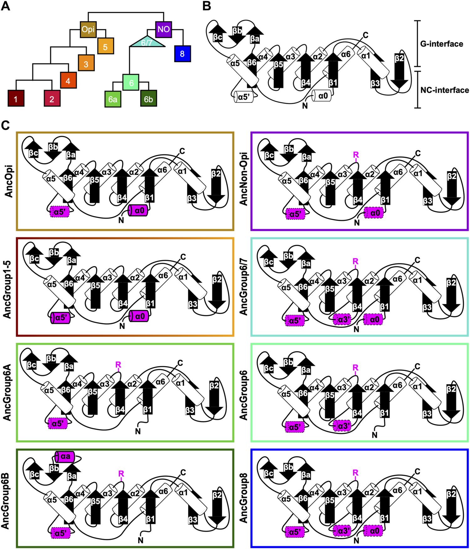 Ancestral sequence reconstruction of key evolutionary nodes throughout septin evolution. (A) Simplified tree diagram displaying the shape of the IQTree (Supplementary Figure S3) used in ancestral sequence reconstruction. Squares and triangle, key nodes with ancestral septins corresponding to interpretive diagrams shown in panel (C). (B) Representative topology diagram of septin GTPase domain indicating both the G-interface and NC-interface. N and C represent the N-terminal and C-terminal end of the protein. α helices and β sheets are each numbered sequentially from the N- to C-termini, except for those in the SUE (βa-βc). (C) Interpretive topology diagrams of the reconstructed ancestral septins at the nodes labeled in panel (A). See Supplementary Figure S4 for the original AlphaFold2 predictions. Ancestral septins for Groups 1–5 are represented by a single diagram because their AlphaFold2 predictions appear largely identical. Structural motifs relevant to this study are highlighted in magenta. Secondary structures outlined in bold solid lines and dotted lines represent motifs with higher (pLDDT >70) and lower (pLDDT <70) AlphaFold confidence scores, respectively. R, arginine finger.