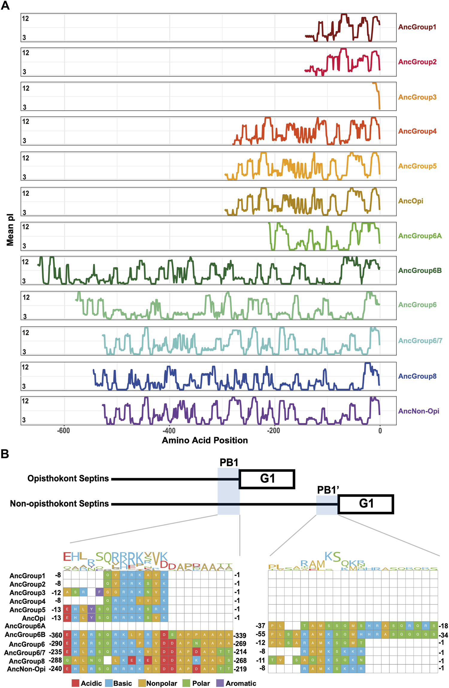 N-terminal polybasic domains across septins. (A) Calculation of isoelectric point windows across the NTE of reconstructed ancestral sequences. The average isoelectric point of a sliding 10 amino acid window is calculated across the NTE of reconstructed ancestral sequences. X = 0 represents the start of the GTPase domain. (B) CLUSTALw multiple sequence alignment of reconstructed ancestral sequences displaying two polybasic domains in non-opisthokont lineages. Numbers indicate the amino acid positions from the start of the GTPase domain.