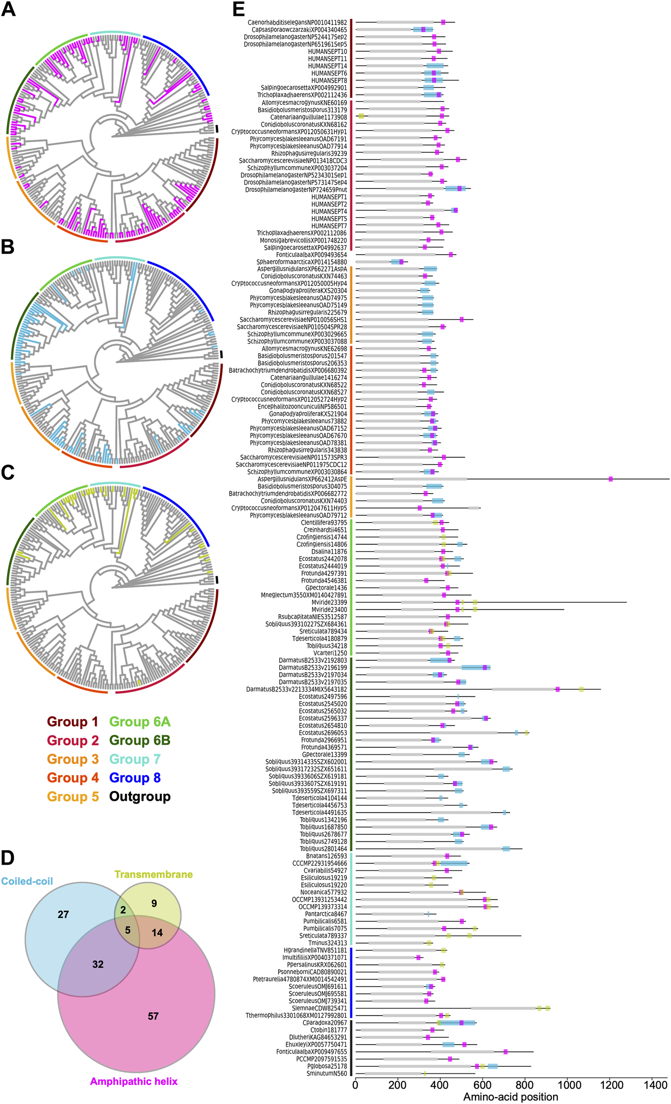 Distribution of AH, coiled-coil, and transmembrane domains across septin groups. (A–C) Simplified cladograms of the RAxML tree of 254 septins (see Figure 2A), with individual sequences with AH (A, magenta), coiled-coil (B, blue), and transmembrane (C, green) domains highlighted. (D) Venn diagram showing the numbers of septins with AH, coiled-coil, and/or transmembrane domains. (E) Protein domain diagrams of septins with AH, coiled-coil, and/or transmembrane domains. Grey box, septin GTPase domain; magenta box, AH domain; blue box, coiled-coil domain; green box, transmembrane domain.