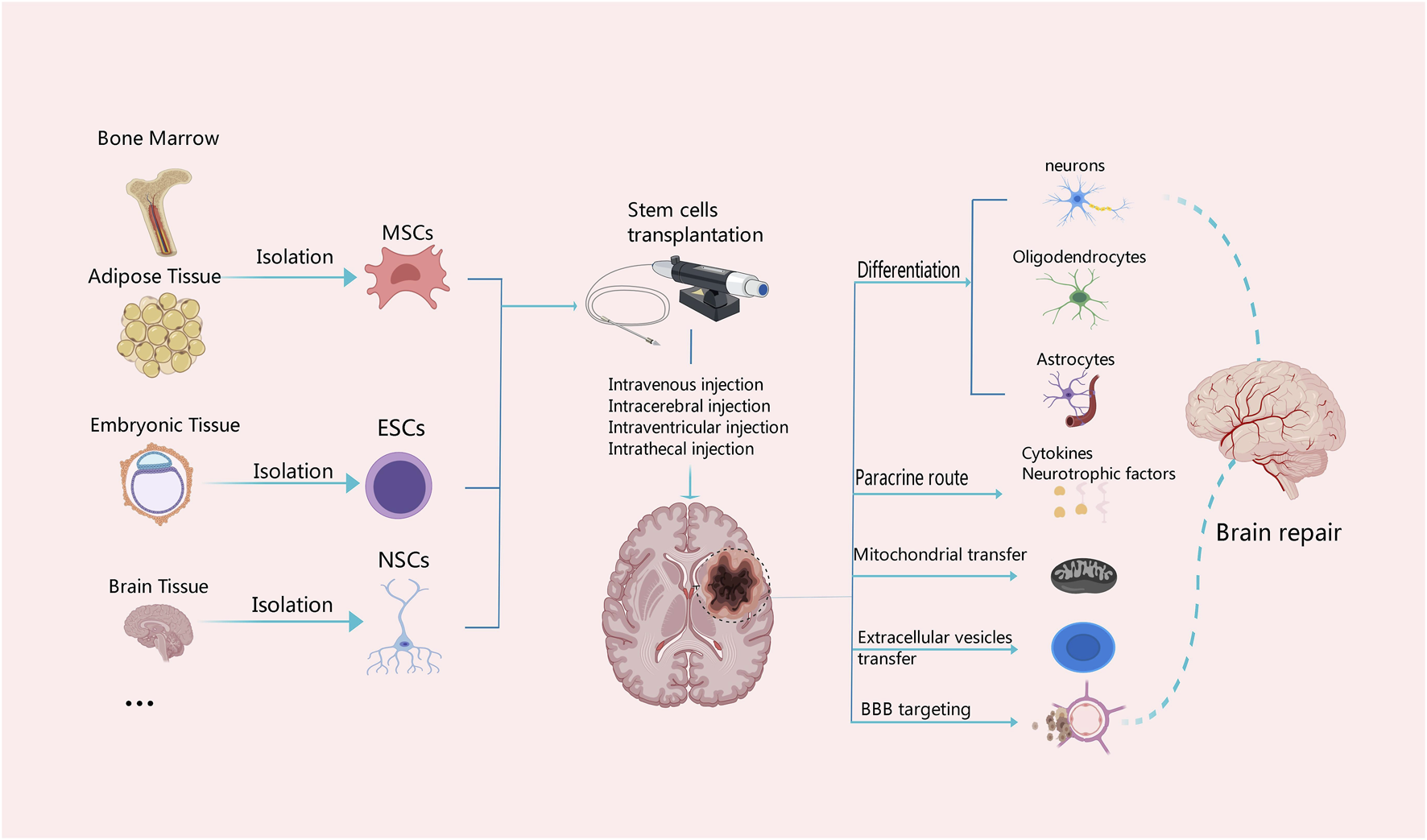 Mechanisms associated with different tissue-derived stem cells in the treatment of ischemic stroke. MSCs can be derived from bone marrow and adipose tissue, ESCs from embryonic tissue, and NSCs from the central nervous system. Stem cells from different tissue sources can be transplanted with intravenous or arterial injection or other measures. Stem cells have the capability of multi-directional differentiation; they can differentiate into neurons, oligodendrocytes and astrocytes, and secrete cytokines and neurotrophic factors, as well as promote the BBB reconstruction and neuronal repair through diverse approaches such as mitochondrial transfer and secretion of extracellular vesicles.