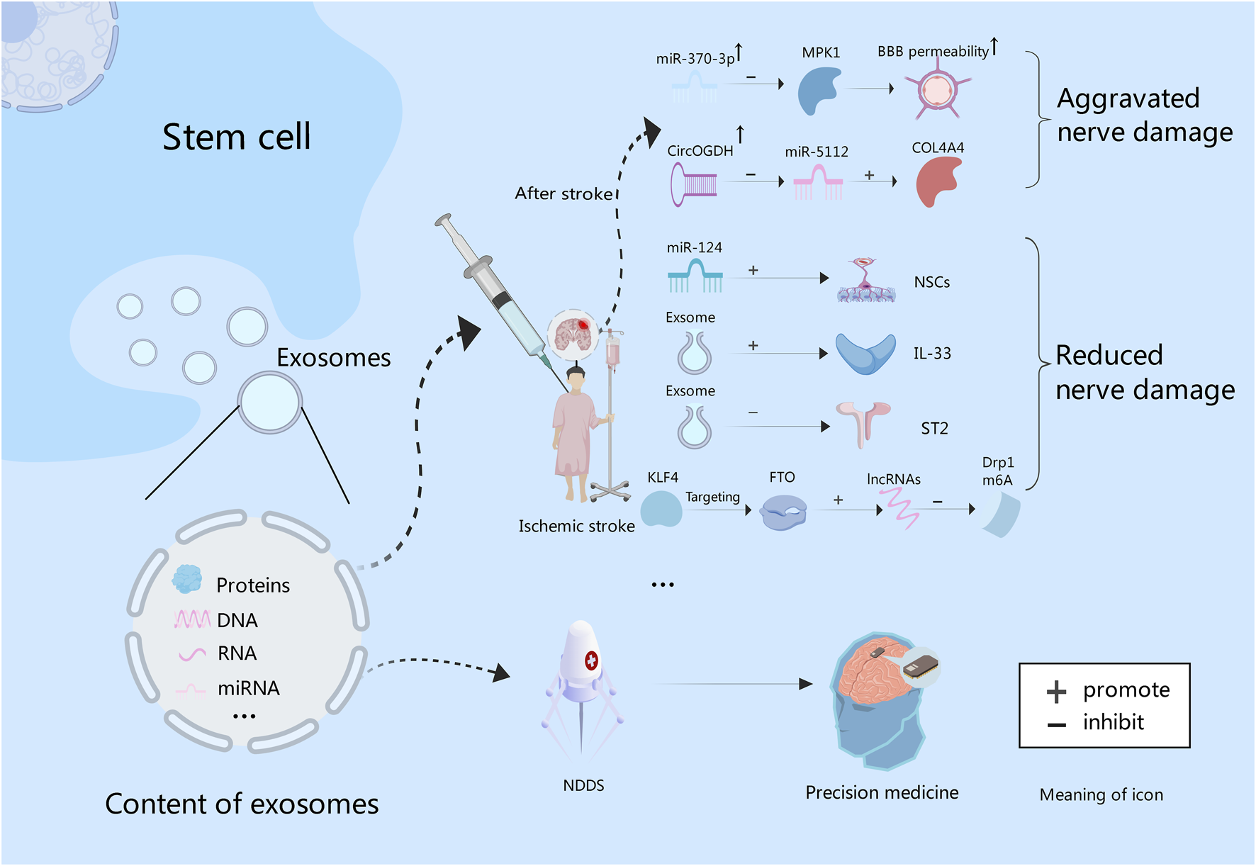 Exosomes contain proteins, and nucleic acids. After stroke, the expression of miR-370 is increased, and BBB permeability can be increased by inhibiting MPK1. While miR-5112 is inhibited by CircOGDH, which can enhance the expression of COL4A4, and thus aggravating brain injury. In addition, exosome-derived miR-124 could promote the proliferation and differentiation of NSCs. Exosomes can improve nerve function by increasing IL-33 level and inhibiting ST2. Also, they can promote lncRNAs expression through KLF4/FTO signaling pathway to inhibit Drp1 m6A modification, thereby inhibiting nerve damage. Finally, exosomes can be used to construct NDDS to deliver targeted drugs to achieve precision treatment of intracranial tumors in the future.