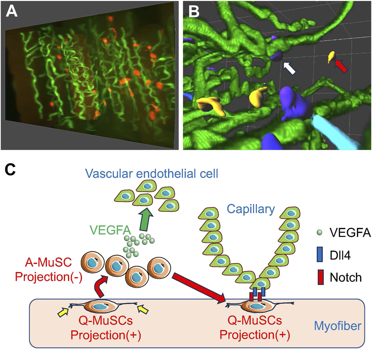 Figure 1. MuSCs reside in close proximity to capillary endothelial cells for MuSC self-renewal (A) Snapshots of MuSCs (red) and capillaries (green) from a 3-D image of mouse skeletal muscle. (B) Images of MuSCs are colored based on their distance from the nearest capillary. Capillaries (green) from a 3-D image of mouse skeletal muscle. Capillaries (green). Orange cells indicate activated MuSCs away from the capillaries (red arrows), and dark blue cells indicate quiescent MuSCs close to the capillaries (white arrows). (C) When activated (A)-MuSCs express VEGFA during regeneration, vascular endothelial cells are recruited in the vicinity of the MuSCs, forming a vascular niche. Subsequently, Notch signaling in MuSCs is activated by Dll4 derived from adjacent vascular endothelial cells, inducing self-renewal of Q-MuSCs. Q-MuSCs have longer, multiple projections (yellow allows), which regress after activation.