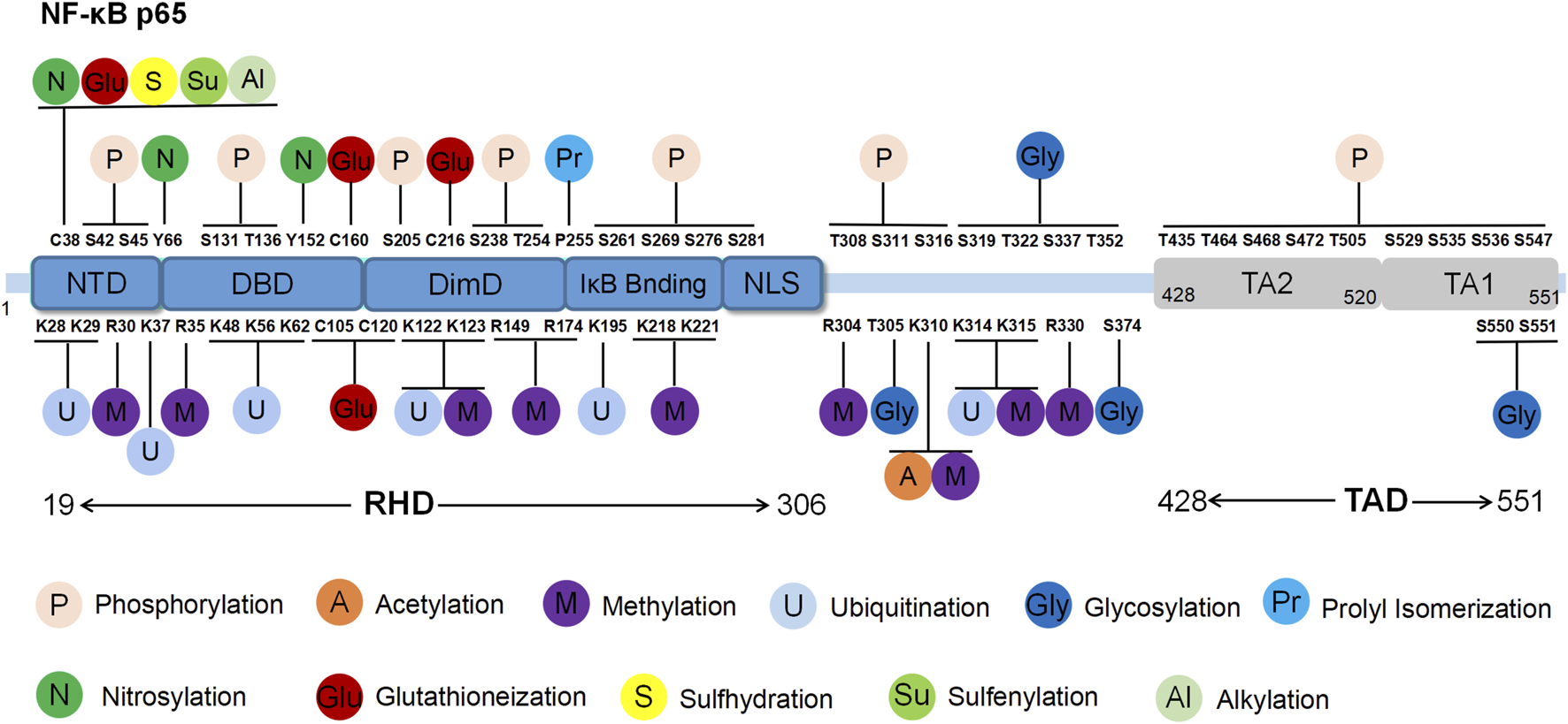 Post-translational modifications of p65.