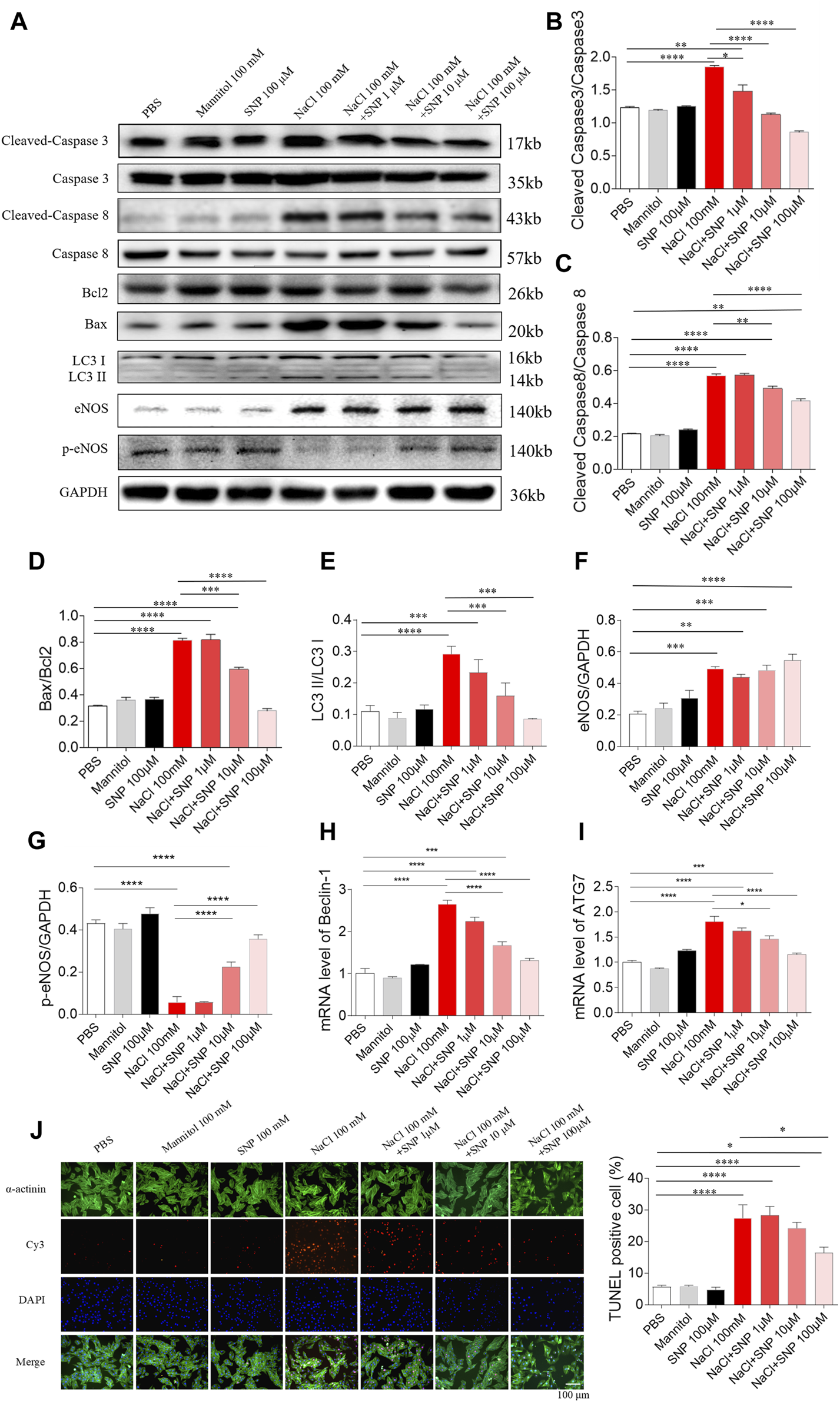 Effects of different doses of nitric oxide donor sodium nitroprusside (SNP) on NaCl-induced apoptosis and autophagy in H9C2 cells. (A–I), SNP attenuated the increases in the levels of cleaved-caspase 3/caspase 3, cleaved-caspase 8/caspase 8, Bax/Bcl2, LC3 II/LC3 I, Beclin-1, and autophagy related 7 (ATG7), and enhanced the decrease of p-endothelial nitric oxide synthase (eNOS) induced by NaCl (100 mM) in H9C2 cells. (J) The increase of TUNEL-positive cell number was inhibited by high dose of SNP (100 µM), but not middle (10 µM) or low dose (1 µM) of SNP. The results are expressed as mean ± SEM. *p < 0.05, **p < 0.01, ***p < 0.001, and ****p < 0.0001.