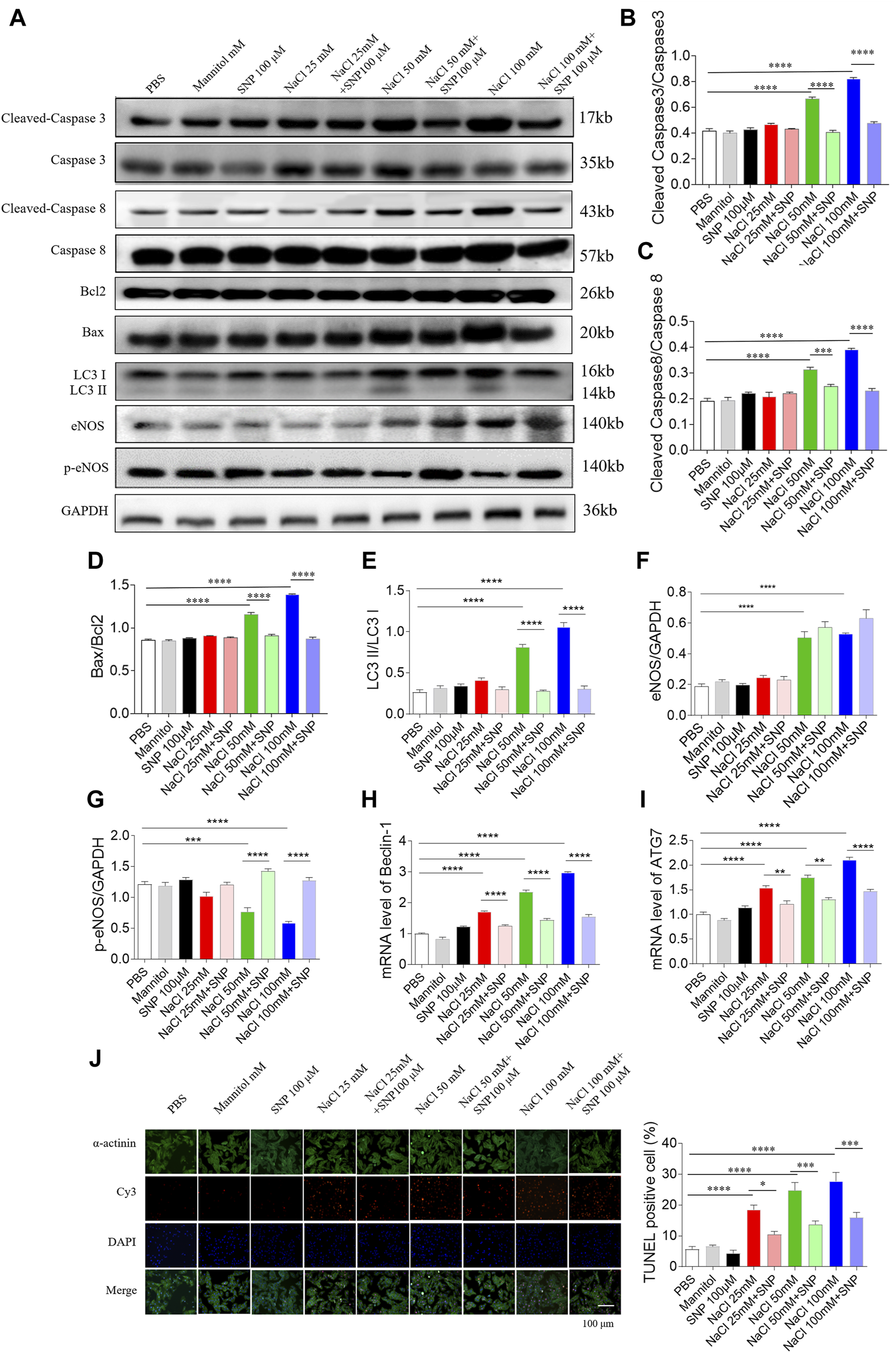 Effects of nitric oxide donor sodium nitroprusside (SNP) on apoptosis and autophagy induced by three doses of sodium chloride (NaCl) in primary neonatal rat cardiomyocytes (NRCM). SNP (100 µM) attenuated the increases in the levels of cleaved-caspase 3/caspase 3 (A, B), cleaved-caspase 8/caspase 8 (A, C), Bax/Bcl2 (A, D), LC3 II/LC3 I (A,E), Beclin-1 (H), and autophagy related 7 (ATG7) (I), and enhanced the decrease of p-endothelial nitric oxide synthase (eNOS) induced by NaCl (50 or 100 mM) in NRCM (F, G). The increases of TUNEL-positive cell numbers induced by three doses of NaCl in the NRCM were attenuated by SNP (100 µM) treatment (J). The results are expressed as mean ± SEM. *p < 0.05, **p < 0.01, ***p < 0.001, and ****p < 0.0001.