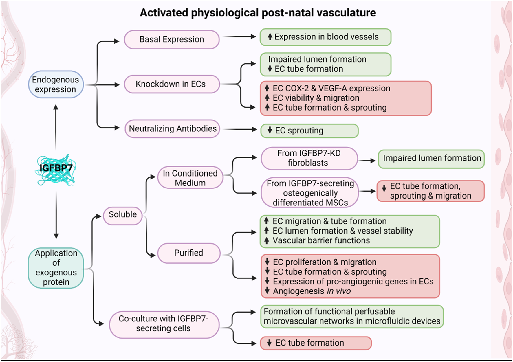 Figure 2. Schematic of effects of IGFBP7 on activated post-natal vasculature. Depending on the experimental design, when IGFBP7 was either added exogenously or its endogenous expression/activity modified, pro-angiogenic (green boxes) or anti-angiogenic (red boxes) properties of IGFBP7 were reported (Schematic was generated using BioRender.com with an academic license).
