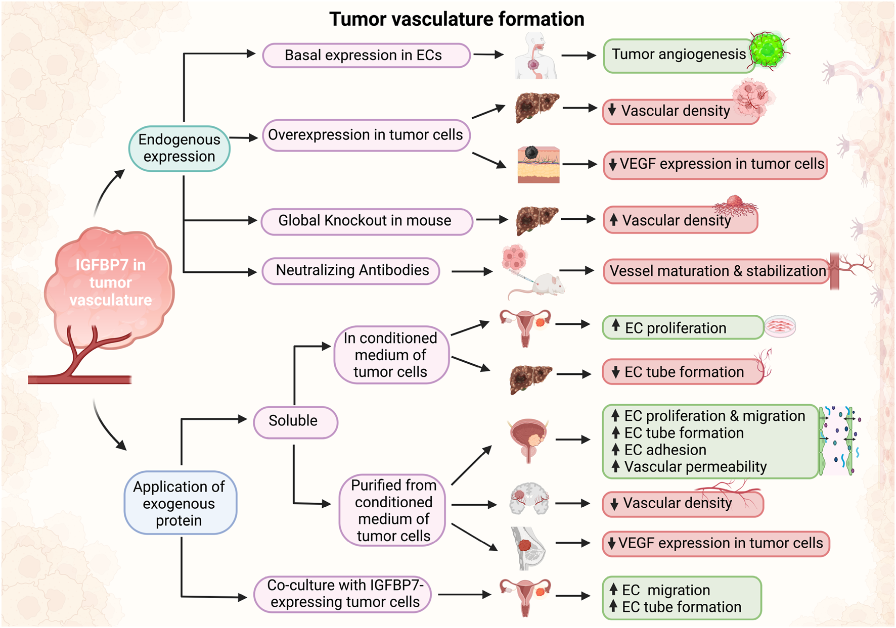 Figure 3. Schematic of effects of IGFBP7 in tumor vasculature formation. Depending on the experimental design, when IGFBP7 was either added exogenously or its endogenous expression/activity modified, pro-angiogenic (green boxes) or anti-angiogenic (red boxes) properties of IGFBP7 were reported (Schematic was generated using BioRender.com with an academic license).