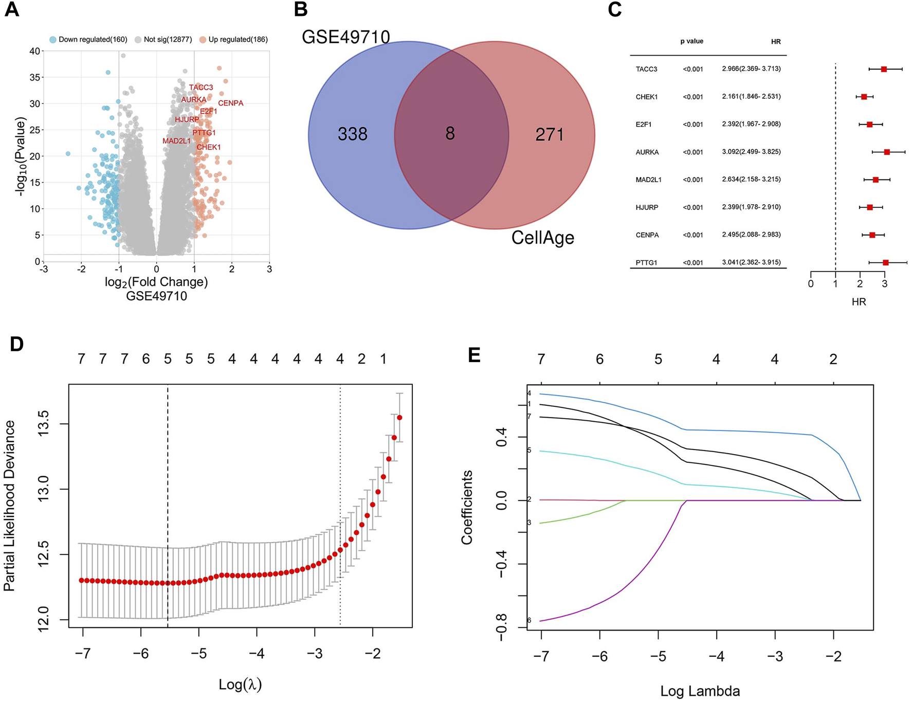 Identification of differentially expressed genes (DEGs) and cellular senescence-related genes (SRGs). (A) Volcano plot depicting DEGs in dataset GSE49710. (B) Venn diagram showing the overlap between DEGs and genes associated with cellular senescence. (C) Forest plot of the univariate Cox regression analysis identifying 8 SRGs. (D) Lasso coefficient curves for five key SRGs: AURKA, MAD2L1, HJURP, CENPA, TACC3. (E) Ten-fold cross-validation for tuning parameter optimization in Lasso models.