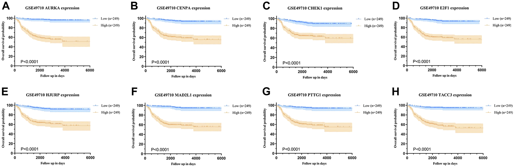Overall survival analysis based on SRG expression in neuroblastoma (NB). (A–D) Kaplan-Meier survival curves for AURKA, CENPA, CHEK1, and E2F1, comparing high vs low expression groups in NB. (E–H) Kaplan-Meier survival curves for HJURP, MAD2L1, PTTG1, and TACC3, comparing high vs low expression groups in NB.