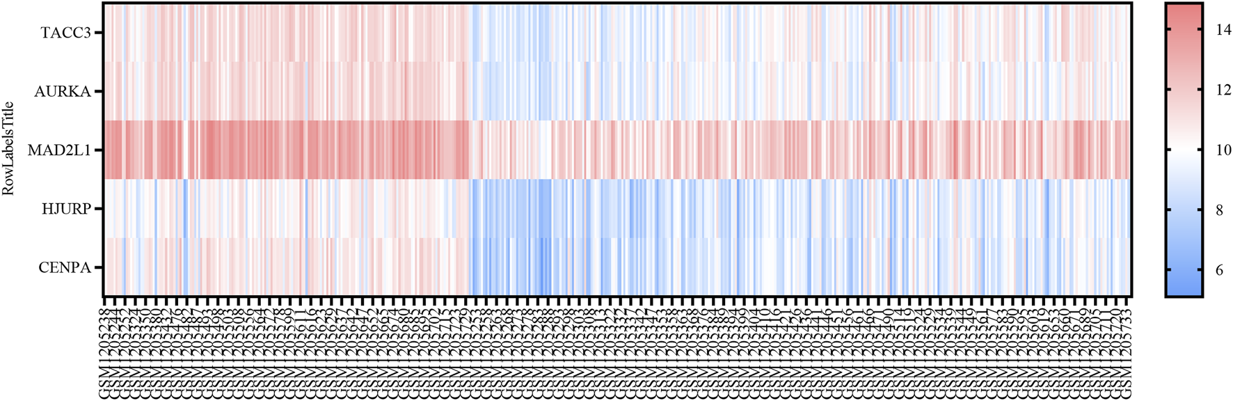 SRS = 0.5782* AURKA expression value +0.2177* MAD2L1 expression value -0.5369* HJURP expression value +0.4630* CENPA expression value +0.4594* TACC3 expression value.