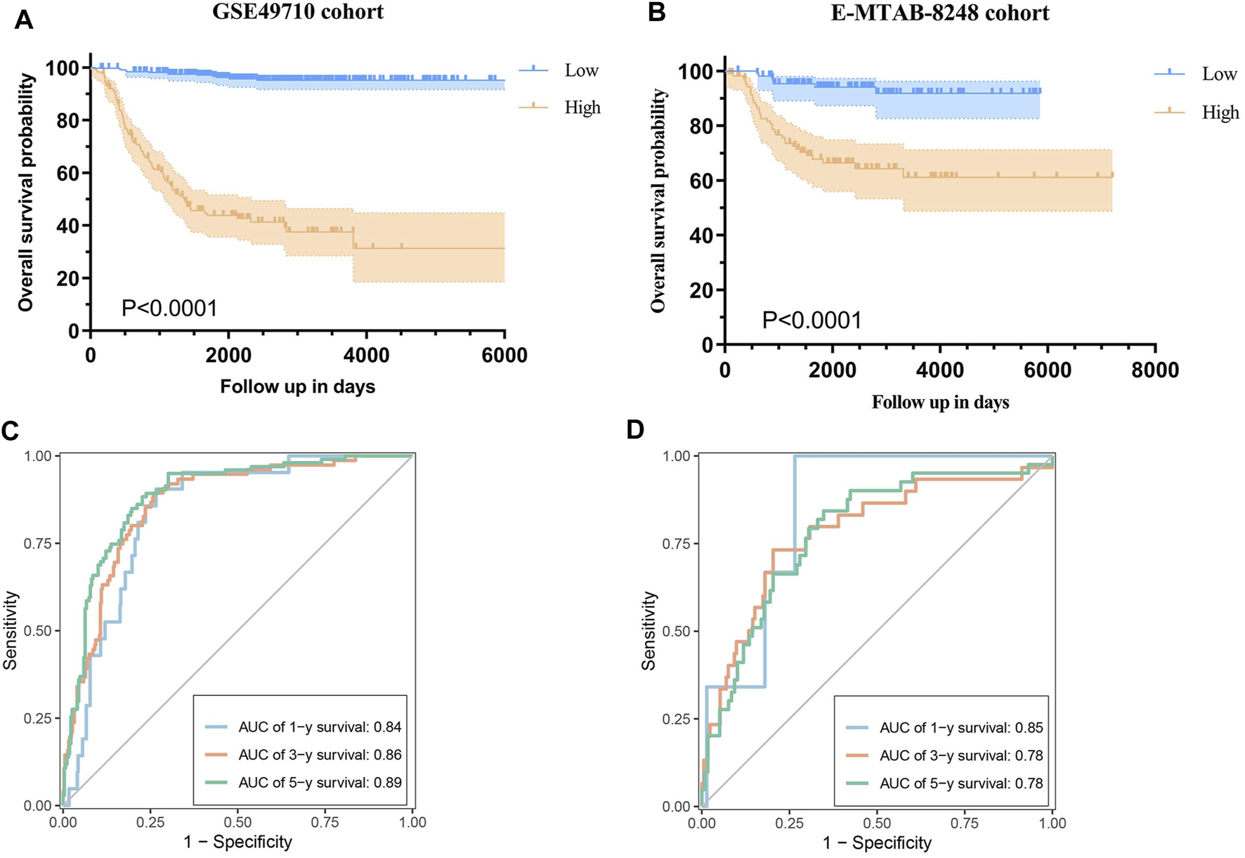 Validation of the Prognostic Model. (A) Kaplan-Meier curves illustrating overall survival (OS) in the GSE49710 cohort based on the risk score. (B) Time-dependent ROC curve analysis for 1-year, 3-year, and 5-year OS in the GSE49710 cohort. (C) Kaplan-Meier curves illustrating OS in the E-MTAB-8248 cohort based on the risk score. (D) Time-dependent ROC curve analysis for 1-year, 3-year, and 5-year OS in the E-MTAB-8248 cohort.