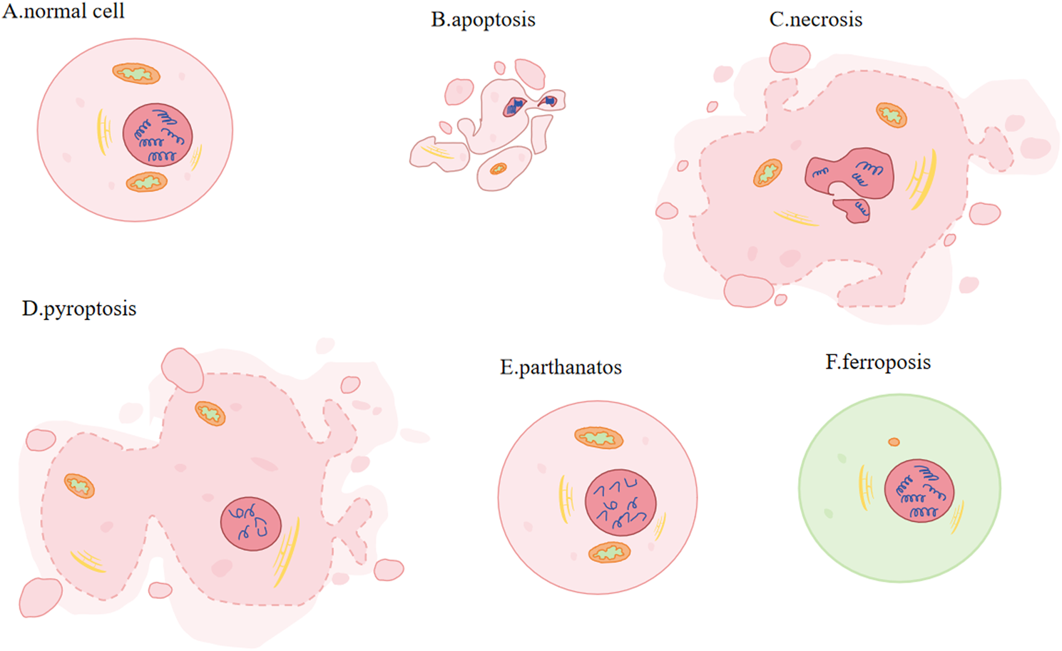 A strong correlation exists between regulatory cell death (RCD) and the onset, advancement, and management of cancer. RCD is critical for immune response, homeostasis maintenance, embryogenesis and other processes (Allocati N et al., 2015). Distinct from accidental cell death, it is regulated by a variety of signal transduction pathways and is susceptible to genetic and pharmacological interferences, which is (Galluzzi L et al., 2018). Several RCD types, each with their distinct molecular mechanisms, have been found by researchers, including apoptosis, necrotizing apoptosis, pyroptosis, parthanatos and ferroptosis (Tang D et al., 2019) (Figure 1).