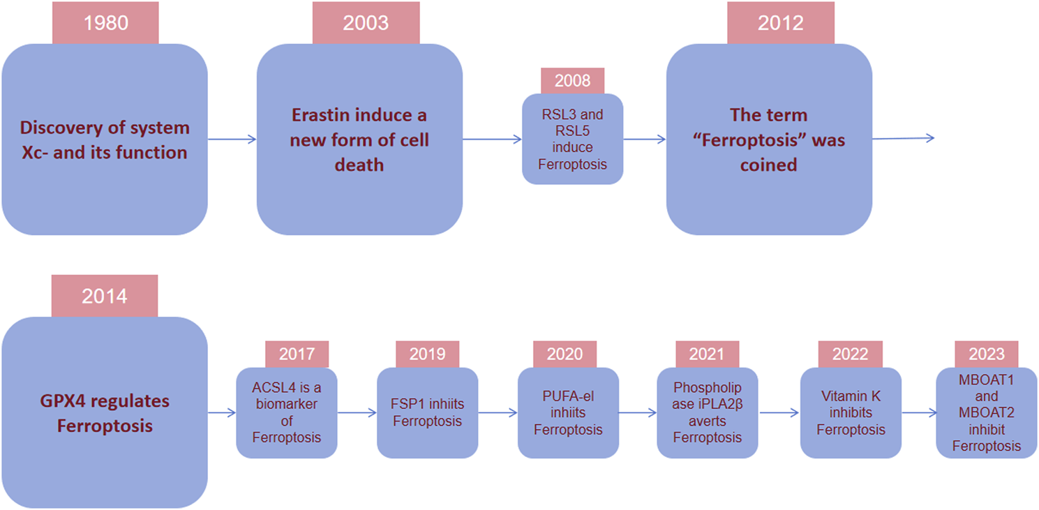 Timeline depicting essential discoveries in ferroptosis research. In 1980, it was discovered that system Xc-, a cystine/glutamate antiporter important for ferroptosis modulation, transports cystine into cells by exchanging glutamate. In 2003, during an experiment screening tens of thousands of compounds for agents to eliminate tumor cells, erastin was identified to selectively cause nonapoptotic, rapid, and irreversible cell death in tumor cells with RAS mutations. In 2012, the term “ferroptosis” was coined because its occurrence depended on the presence of iron. In 2014, it was confirmed that GPX4 regulates ferroptosis. In recent years, various regulatory mechanisms of ferroptosis and their regulatory substances have been gradually discovered.