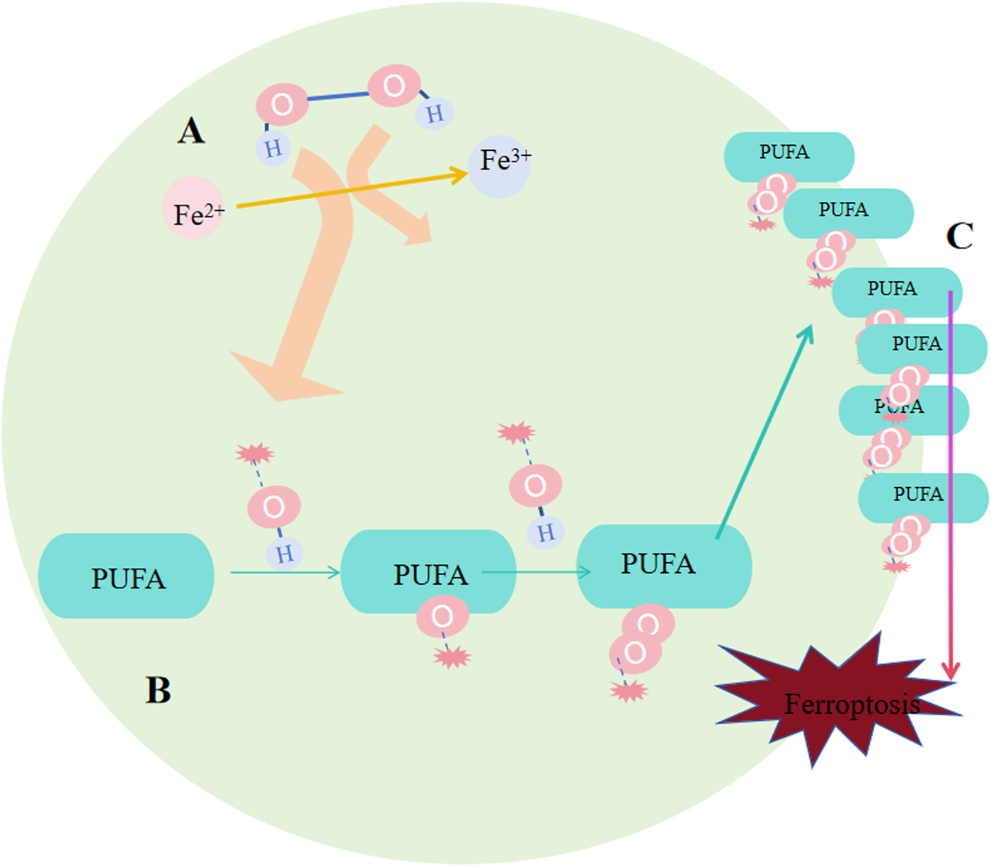 Occurrence of ferroptosis. (A) Following the Fenton reaction, hydroxyl radicals (HO∙) were generated from hydrogen peroxide (H2O2) within the cells. (B) HO∙ oxidizes lipids to produce RO∙, and RO∙ can be further oxidized into peroxyl radicals (ROO∙). An increasing number of new RO∙ and ROO∙ can be formed based on the preceding HO∙ and RO∙ through the mechanism of positive chain reactions. (C) Lipid peroxidation undermines the integrity of the membrane, affecting cell survival because of its crucial role in constituting the biological membrane and maintaining cell shape and function.