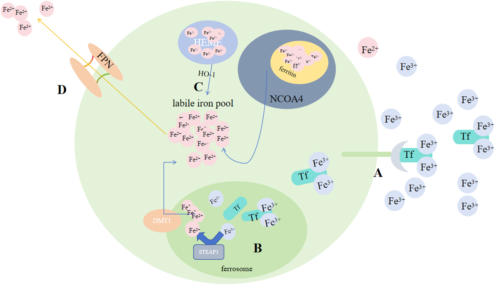 Regulation of ferroptosis by iron metabolism. (A) By binding to Tf, Fe3+ circulating in the blood can be transported into cells via TFRC-mediated endocytosis. (B) After being taken into the cells, STEAP3 on the ferroptosome can reduce Fe3+ to Fe2+. (C) Subsequently, DMT1 could release Fe2+ to the LIP, and by binding directly to FTH1; NCOA4 could induce phagocytosis of ferritin, leading to ferritin degradation and an increase in free iron in cells; Catalyzed by HO-1, Fe2+ released from heme. (D) FPN exports Fe2+. Abbreviations: Tf, transferrin; TFRC, transferrin receptor; STEAP3, six-transmembrane epithelial antigen of prostate 3; DMT1, metal-ion transporter 1; LIP, labile iron pool; NACO4, nuclear receptor coactivator 4; FPN, Ferroportin.