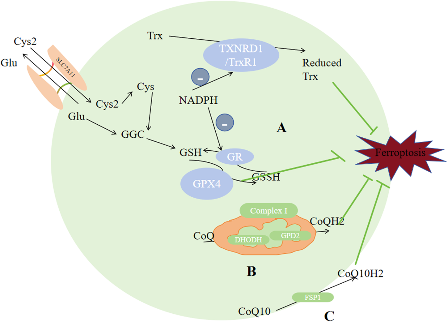 Enzymes regulate ferroptosis. (A) GPX4 and TXNRD1 exert antioxidant functions through the metabolism of GSH and reduced Trx. (B) CoQ was reduced to CoQH2 by DHODH in the mitochondria. (C) CoQ10 was reduced to CQ10H2 by FSP1. Reduced thioredoxin (Trx), glutathione (GSH), CoQH2, and CoQ10H2 are reducing substances capable of compensating for lipid peroxidation which serves as the raw material for ferroptosis. Abbreviations: Cys2, cystine; Cys, cysteine; Glu, Glutamate; SLC3A2,solute carrier family 3 member2; SLC7A11,solute carrier family 7 member 11; GPX4,glutathione peroxidase 4; GR, glutathione reductase; GSH, glutathione; GSS, Glutathione synthetase; GSSH, glutathione counterpart; Trx, thioredoxin; TXNRD1/TrxR1,thioredoxin reductase 1; CoQ10,ubiquinone; FSP1,ferroptosis inhibitor protein 1.