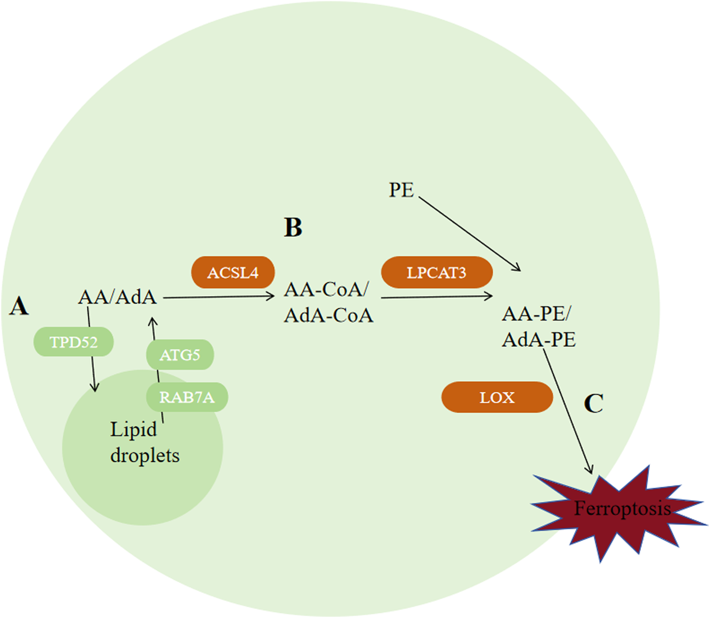 Regulation of ferroptosis by lipid metabolism. (A) Autophagy of lipid droplets releases PUFAs, among which AA and AdA are the two types of polyunsaturated fatty acids that are most susceptible to peroxidation. (B) ACSL4 catalyzes the binding of free AA and AdA to CoA, generating AA-CoA and AdA-CoA, respectively. Then, LPCAT3 promotes their esterification to react with membrane phosphatidylethanolamine (PE) by specifically binding acyl groups to PE-CoA and phosphatidylcholine (PC), forming AA-PE and AdA-PE. (C) PUFAs can be oxidized into their corresponding hydroperoxides by lipoxygenases (LOXs) to produce AA-PE-OOH and AdA-PE-OOH. Abbreviations: ATG5, autophagy-related protein 5; RAB7A, RAS-related protein 7A; AA, arachidonic acid; AdA, adrenal acid; TPD-52, tumor protein D52; ACSL4, acyl-CoA synthetase long-chain family member 4; PE, phosphatidylethanolamine; LOX, lipoxygenase.