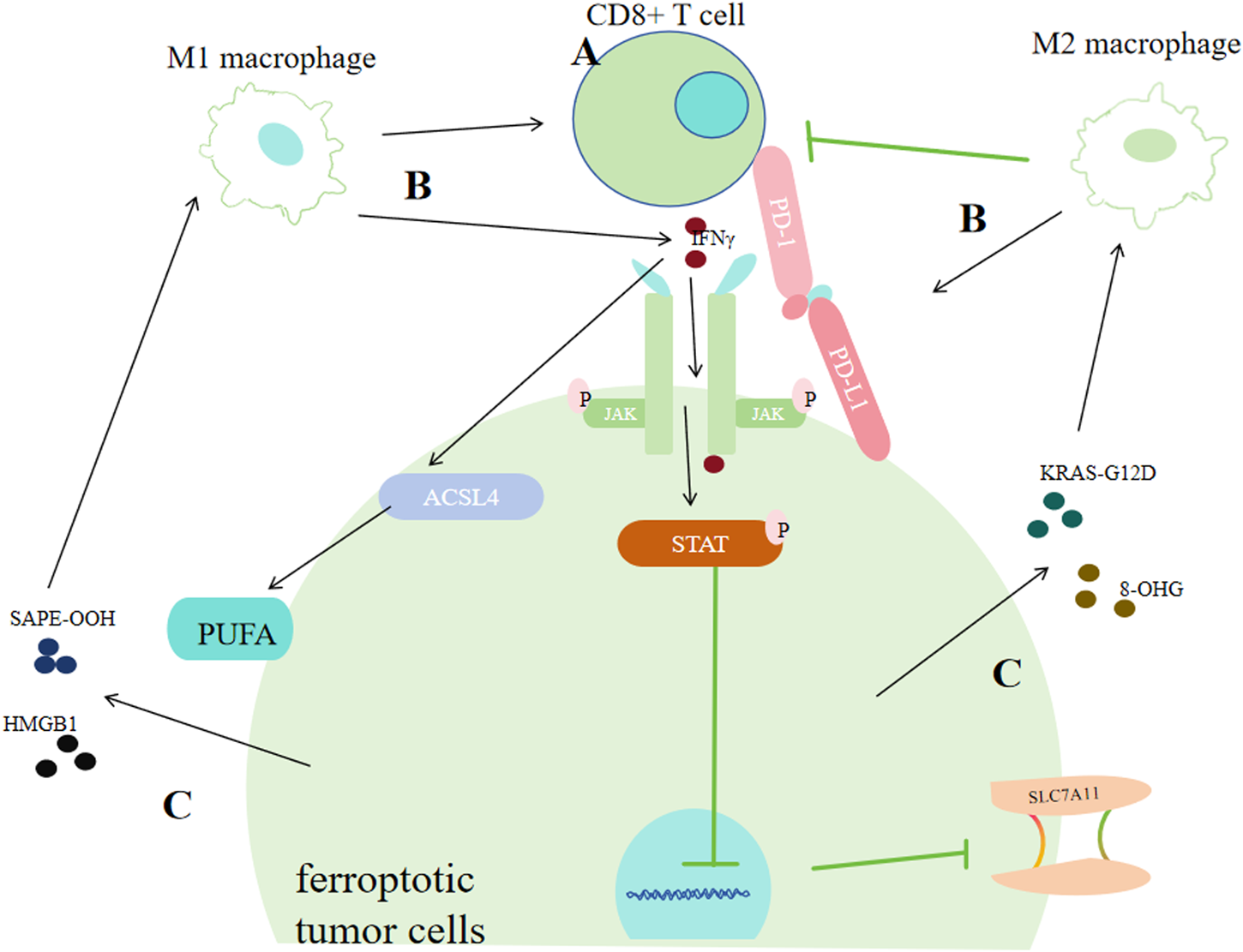 Correlation between tumor cell ferroptosis and the tumor immune system. (A) CD8+ T cells promote ferroptosis in cancer cells by secreting interferon-γ (IFNγ). IFNγ can strengthen the binding of the xCT transcription start site with STAT1, thus inhibiting its transcription or it can promote ACSL4. (B) Macrophages exert dual effects on cancer cells via ferroptosis. M1 macrophages promote ferroptosis by facilitating CD8+ T cells or by secreting IFN-γ. M2 macrophages inhibit ferroptosis of cancer cells by enhancing PD-L1 or restraining CD8+ T cells. (C) Ferroptotic cancer cells exert dual effects on the immune system by releasing DAMPs. Cancer cells can promote the transformation of macrophages into the M1 type by secreting SAPE-OOH or HMGB1, or promote the transformation of macrophages into the M2 type by secreting KRAS-G121D or 8-OHG.