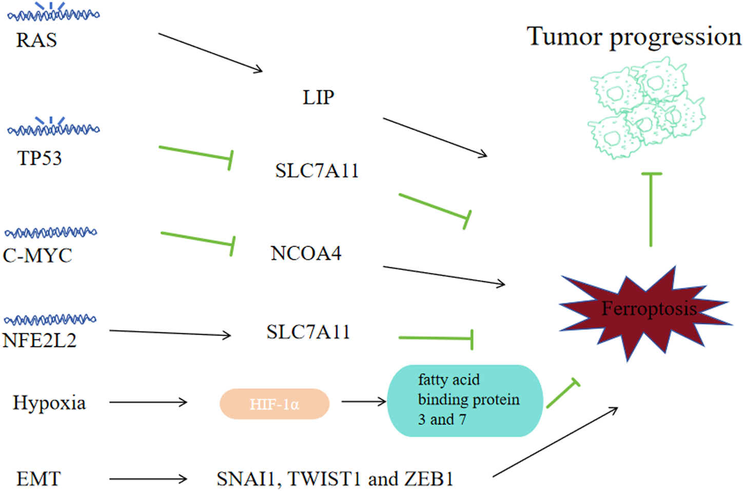 Correlation between ferroptosis and tumor progression. Some tumor oncogenes, suppressor genes and physiological phenomena-related signals may affect tumor cell sensitivity to ferroptosis, thus affecting tumor progression. Mutated RAS promotes ferroptosis by regulating iron metabolism genes; Mutated TP53 can promote ferroptosis by downregulating SLC7A11; C-MYC can inhibit ferroptosis by suppressing NCOA4 and inhibiting mitophagy; NFE2L2 can inhibit ferroptosis by upregulating SLC7A11; Hypoxia helps to accumulate HIF1α and upregulates fatty acid-binding proteins 3 and 7, inhibiting ferroptosis; High transcriptional levels of EMT-related SNAI1, TWIST1 and ZEB1 come with high sensitivity to ferroptosis.