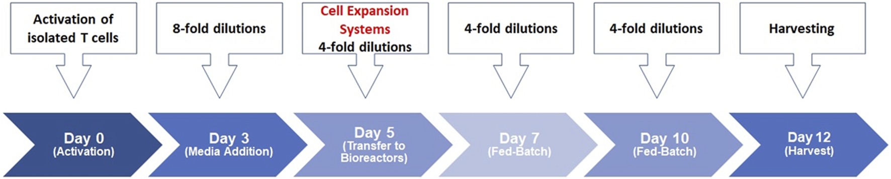 Human T-cell expansion timelime. T-cells were stimulated on day 0 using ImmunoCult™ Human CD3/CD28/CD2 T-cell Activator in ImmunoCult™-XF T-cell Expansion Medium supplemented with IL-2 in static culture. Total culture volumes were increased by 8-fold using fresh medium on day 3. Total culture volumes were further increased by 4-fold on day 5 and transferred to the respective bioreactor systems. Basal media was added to the cultures by 4-folds on day 7 and day 10 until harvest on day 12 of the process.