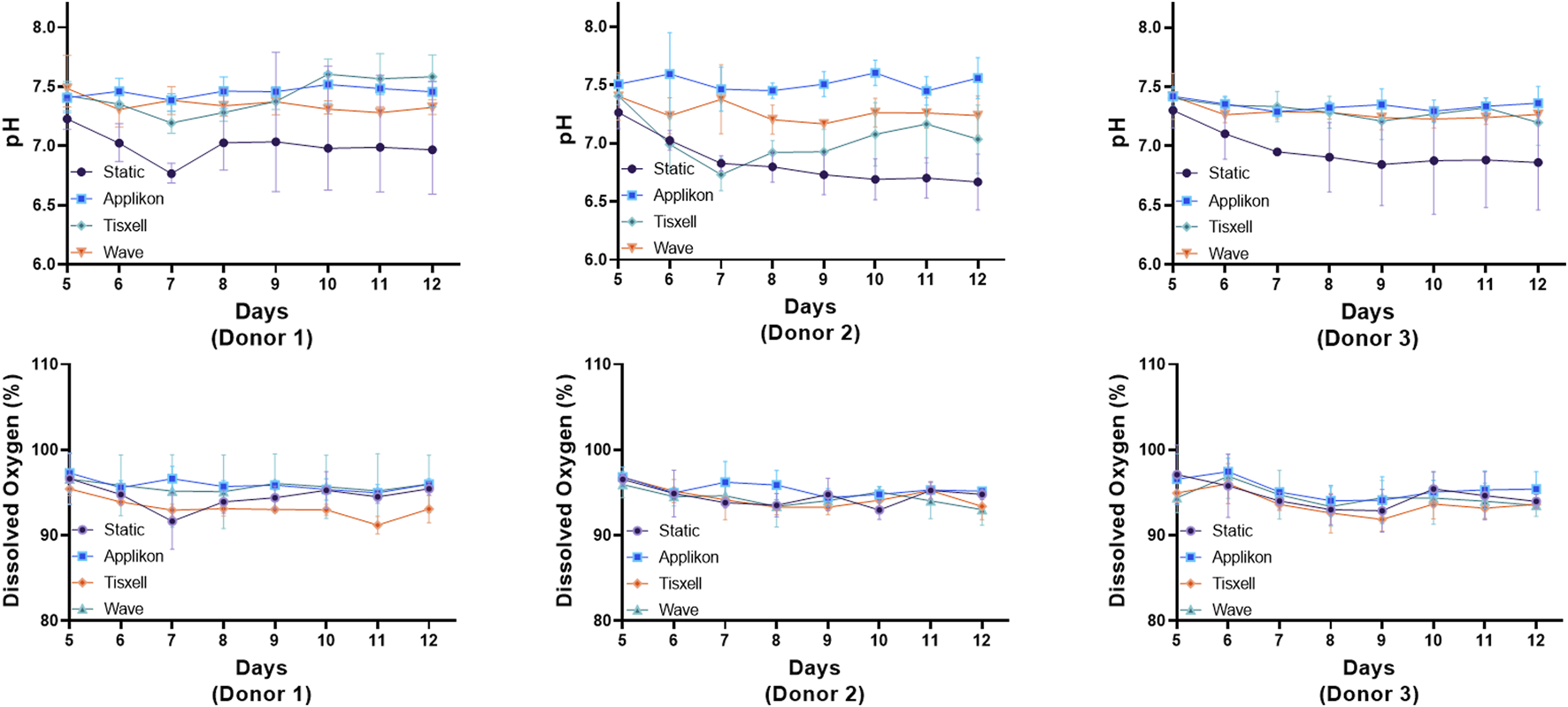 Figure 3. pH and dissolved oxygen (DO) trends under various bioreactors. The Applikon and Wave reactors had automatic process control of pH and DO (gas sparging). The pH profiles aligned with the viable cell concentration and with the exhaustion and yield of metabolites. DO remains stable >95% throughout the culture duration while matching the oxygen demand for cell growth. The subtle spikes observed in both pH and DO are due to media addition on respective days. Data are shown as mean ± SD.