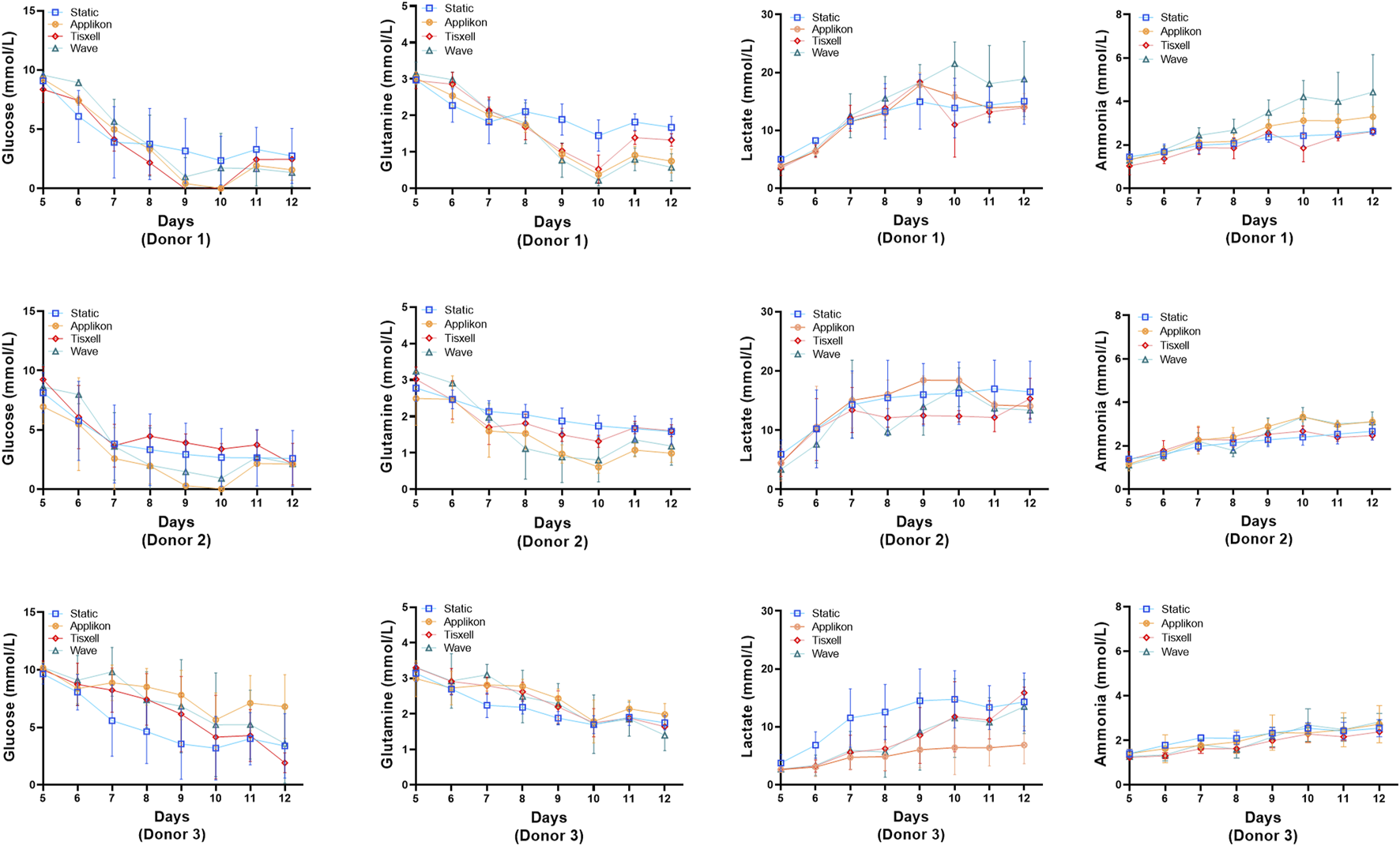 Figure 4. Metabolite concentrations for the bioreactors. Levels of glucose, glutamine, lactate and ammonia were monitored daily. Glucose and glutamine consumption correlates well with the cell growth kinetics data. Lactate and ammonia production reflects the expansion cell growth trend. Lactate generation peaked from Day 7 followed by rapid decline of glucose and glutamine. Data are shown as mean ± SD.