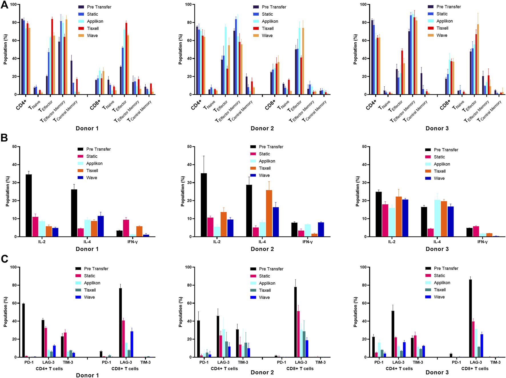 Figure 5. Phenotype characterization of T-cells. (A) T-cell differentiation Surface markers, (B) Exhaustion markers and (C) Intracellular cytokines. T-cells subpopulations are analyzed pre-transfer and post-harvest on all culture systems. Cell populations are gated based on isotype controls. Cell quality was assessed based on CD4+ and CD8+ T-cell subpopulations. (A) CD4 to CD8 T-cell ratio was taken as a quality indicator of the final yields. Ratio (CD4:CD8) was higher (5:1) before transfer and reduced (2:1) as the expansion progressed. Expression profiles of the memory cell types had increased progressively for all donors. (B) Potential T-cell exhaustion was assessed in the harvested cell products. The upregulated inhibitory markers (PD-1 and LAG-3) on pre-transfer indicate the poor proliferation abilities of the cultivated T-cells. It was noted that collective suppressive markers decreased significantly along with the cell expansion. (C) T-cell function was evaluated by measuring the levels of intracellular cytokines. T-cells secreted high amounts of pro-inflammatory (IL-2 and IFN-γ) and anti-inflammatory (IL-4) cytokines upon stimulation (pre-transfer). Harvested T-cells had greatly reduced background levels across all donors. Data are shown as mean ± SD.