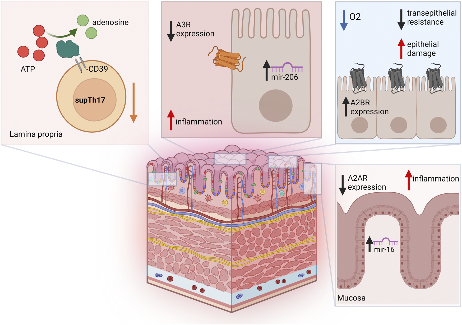 Figure 2. Adenosine-related pathways in IBD. Blood and lamina propria of Crohn’s disease patients are characterized by reduced frequencies of suppressive CD39+ Th17-cells (supTh17), an immunoregulatory Th17-cell population that is impaired in IBD. In colon epithelial cells from UC patients, A3R is downregulated, and its expression levels inversely correlate with mir-206. Increase in A2BR levels during intestinal IRI and acute hypoxia has been implicated in reduced transepithelial resistance and increased epithelial damage. In the colonic mucosa of UC patients, A2AR is post-transcriptionally downregulated by miR-16, this limiting A2AR anti-inflammatory effects.